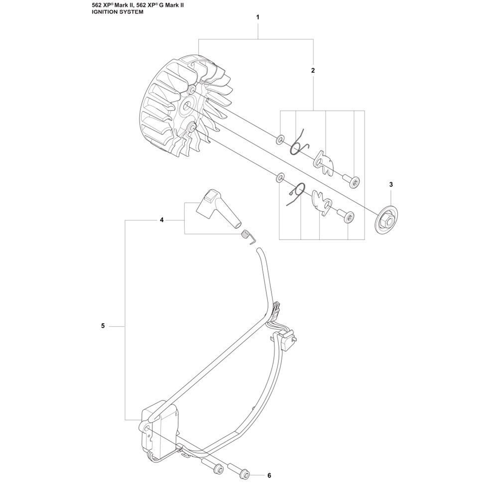 The Ignition System Assembly for the Husqvarna 562XPG Mark II Chainsaw ensures optimal engine performance and reliability. This assembly includes key components such as the ignition coil, flywheel, and spark plug, which work together to provide efficient spark generation and timing. Designed for durability, these genuine Husqvarna parts help maintain the chainsaw's power and efficiency.