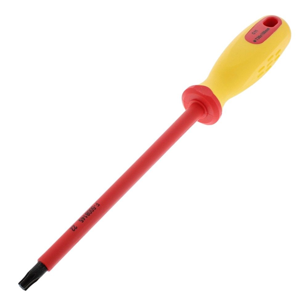 The Insulated Star* Screwdriver T30 is a precision tool designed for safety and efficiency in electrical applications. Crafted with a robust S2 steel shaft, this screwdriver features a Star* T30 profile, making it ideal for tasks requiring precision and reliability. The 150mm (5.9 inches) shaft is insulated, allowing safe use on live circuits up to 1500V DC or 1000V AC. Its PP/TPR handle ensures a comfortable grip, reducing hand fatigue during prolonged use. This tool is VDE/GS approved, ensuring it meets high safety standards, making it suitable for both professional tradespeople and DIY enthusiasts.