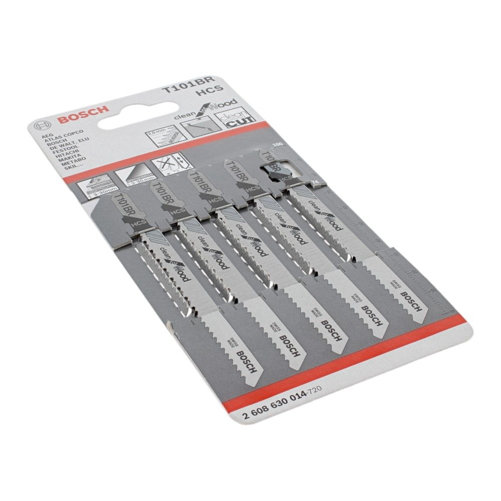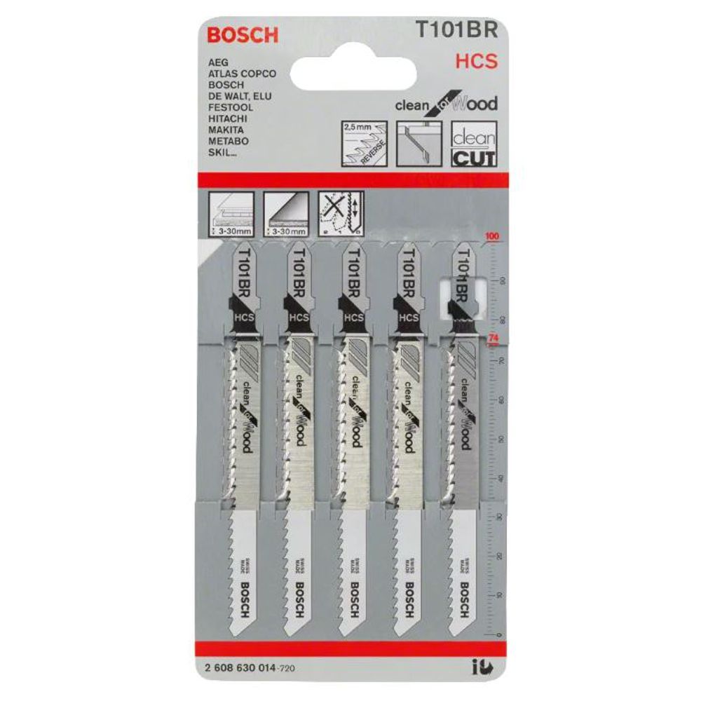 Bosch T 101 BR reverse‐tooth jigsaw blades, down‐cut jigsaw blades for wood, HCS wood jigsaw blades 100mm, Bosch wood blades 5‐piece set, OEM 2608630014, Bosch code 2608630014, reverse‐cut wood jigsaw blades, T‐Shank wood blades for clean top‐surface cuts.