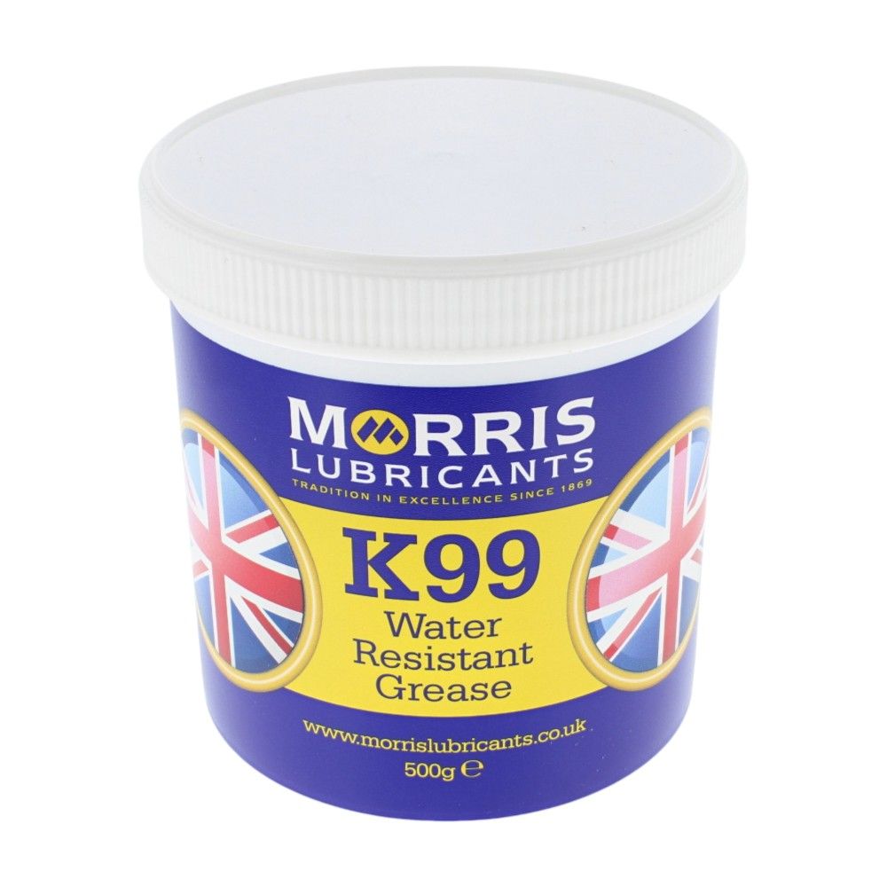 K99 Water Resistant Grease (500g) by Morris Lubricants is a genuine, premium mineral-oil-based grease designed for components that must keep working in very wet conditions. It uses a calcium 12‐hydroxystearate thickener to deliver strong mechanical stability and excellent resistance to water washout. This makes it a dependable choice for plain and rolling element bearings, as well as stern tubes, where reliable lubrication and protection are essential. Ideal for construction plant and garden machinery exposed to rain, washdown or splash, it helps maintain smooth operation and guards against wear. The 500g pack is suitable for workshop or site use, supporting both professional maintenance schedules and DIY upkeep. A genuine Morris product, it offers consistent quality and performance across varied wet‐service tasks.