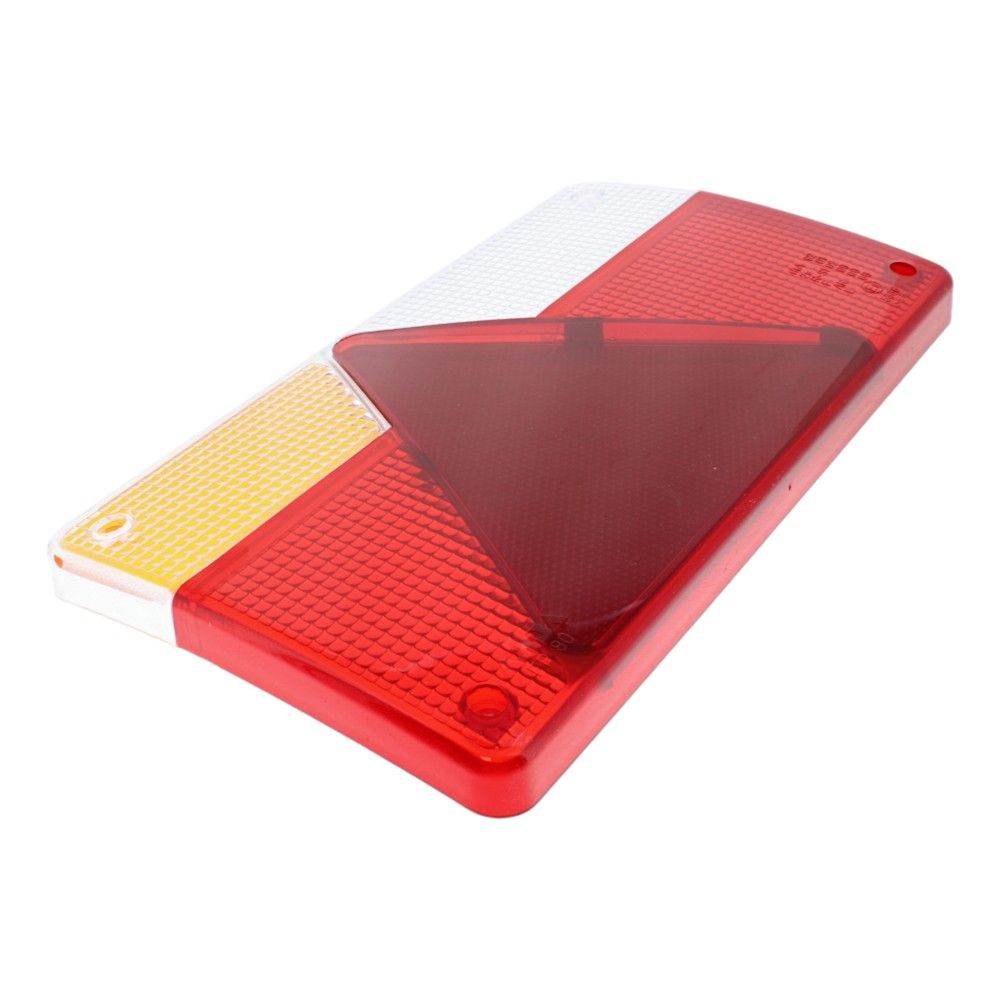 The Left Hand Rear Lamp Lens 237x138x19 mm is a replacement lens for left-hand rear combination lights on construction and garden machinery. Made from durable, shockproof plastic, it is designed to cope with vibration, knocks, and weather on site or in the yard. The lens features red, amber, and clear sections to support position/tail, stop, indicator, and rear fog functions when fitted to the correct lamp body. Its compact rectangular form makes it suitable for compact tractors, ride-on mowers, mini excavators, site dumpers, and similar equipment. Overall size: 237 x 138 x 19 mm (9.33 x 5.43 x 0.75 in). ECE-R3 approved for compliant performance. A practical choice for restoring visibility and safety where the original lens is cracked, faded, or missing.
