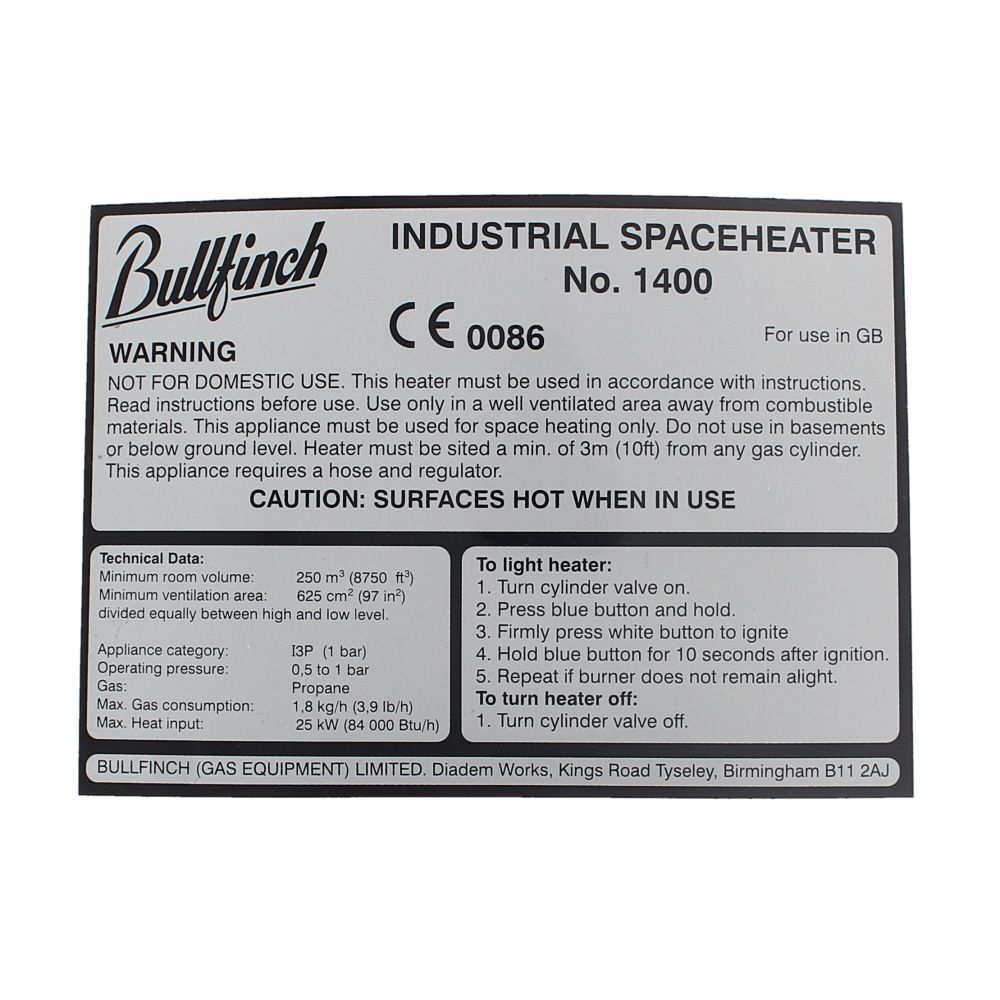 The Label for Bullfinch 1400 Space Heater (B1400T) is a replacement identification and safety label for the Bullfinch 1400 Space Heater. It is made from a durable, abrasion‐resistant material with a strong self-adhesive backing to bond securely to the heater casing. The label carries clear operational guidance and safety warnings so users can light, operate, and shut down the heater correctly, while keeping essential information visible for maintenance and inspections. Purpose-built for the Bullfinch 1400, it restores missing or worn information plates and helps keep equipment safe and easy to use on site. Suitable for tradespeople, facilities teams, and DIY users who need reliable, legible safety information on their space heater to support correct day-to-day operation.