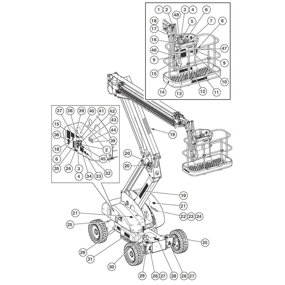 The Label Locations Assembly for Niftylift HR21 SP64 4X4 Access Platforms ensures correct placement of essential labels for safe operation and maintenance. This genuine Niftylift part is crucial for maintaining compliance and safety standards. Designed specifically for the HR21 SP64 4X4 model, it includes various label types for different components and areas of the platform.