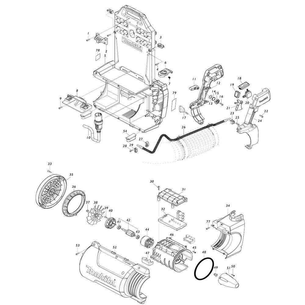 The Lever and Motor Housing Assembly for the Makita UB002C Blower includes key components essential for the blower's operation and durability. This assembly ensures the motor is securely housed and operational, providing stability and efficiency. Genuine Makita parts are used to maintain the blower's performance and extend its service life.