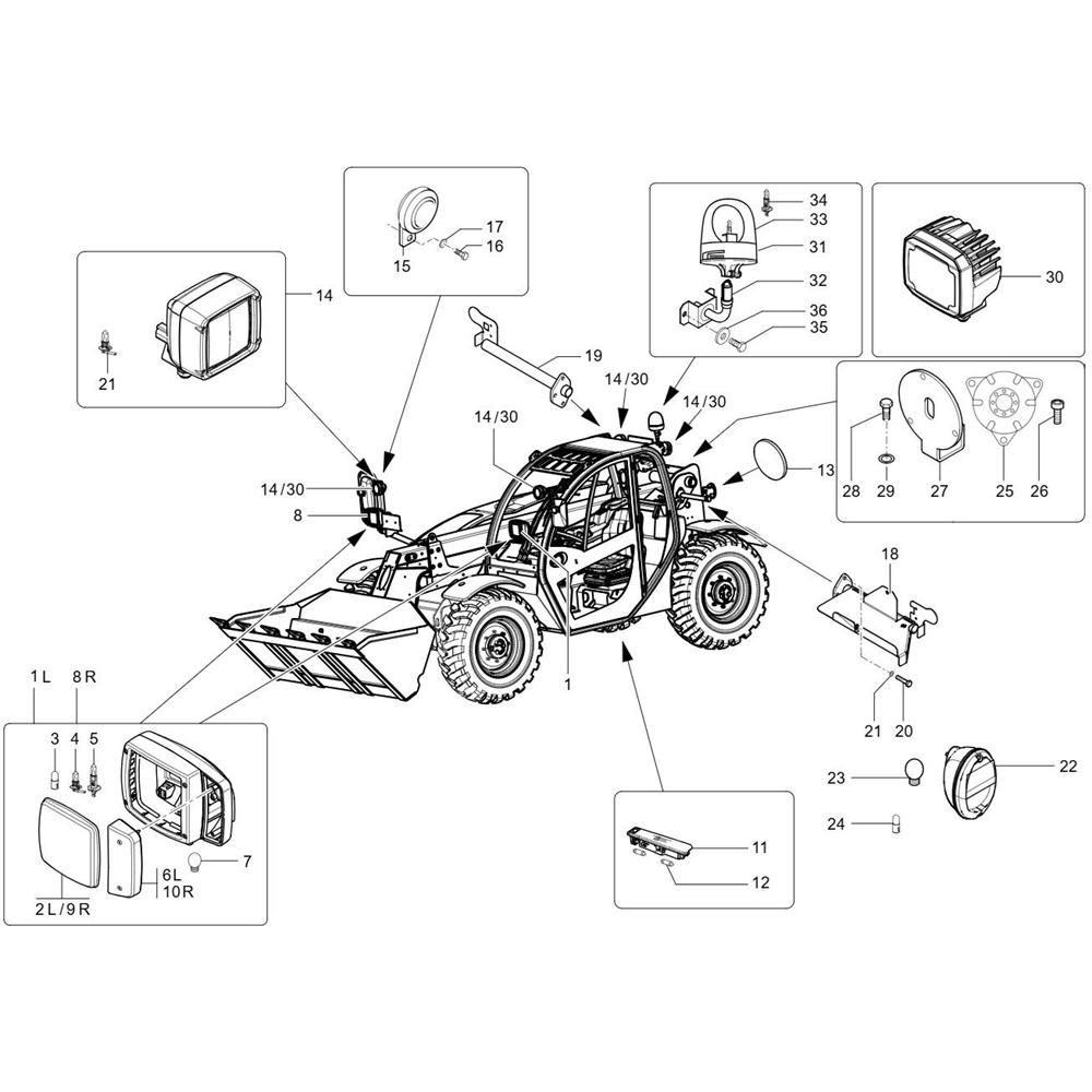 The Lighting Assembly for the Wacker TH627 Telehandler includes essential components to ensure optimal visibility and safety during operation. This assembly is crucial for maintaining the telehandler's lighting system, providing reliable illumination in various working conditions. Components may include bulbs, lenses, and wiring harnesses, designed to fit the Wacker Neuson model precisely.