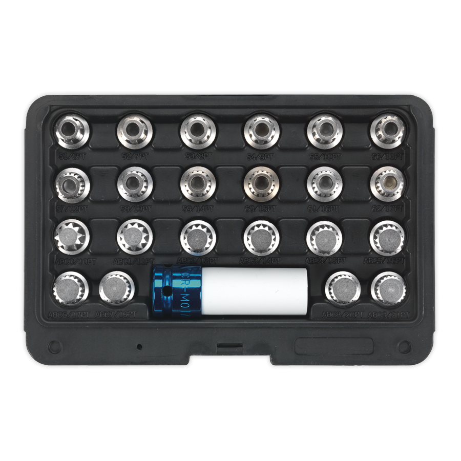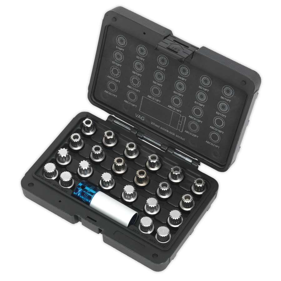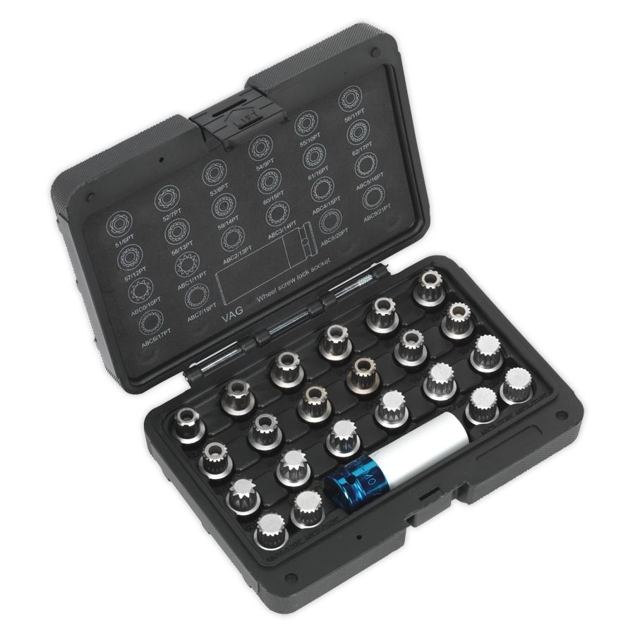 - Set of twenty-two keys for the removal of spline and security ribe locking wheel nuts on VAG vehicles.