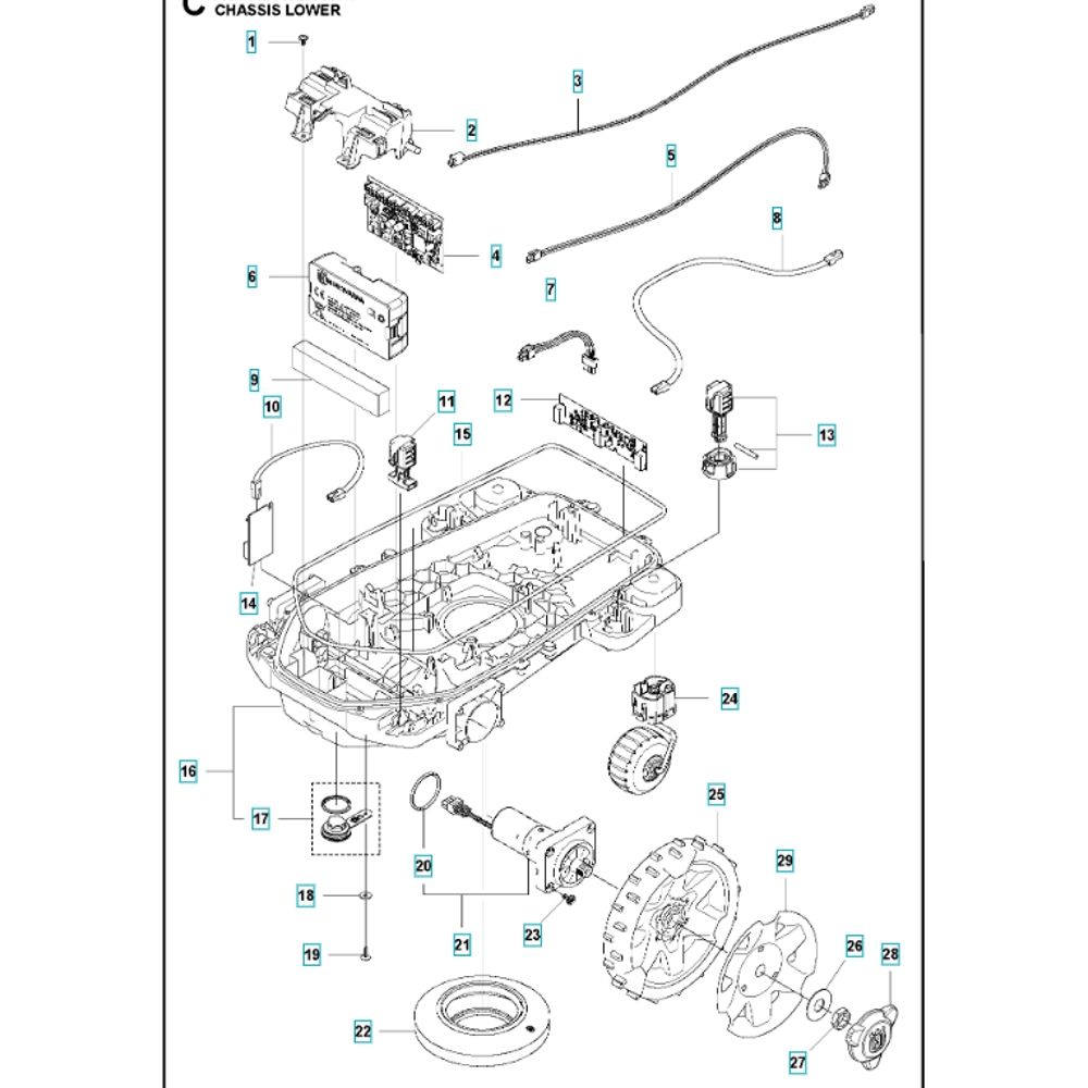 The Lower Chassis Assembly for the Husqvarna Automower 405X is designed to support the mower's structure and protect internal components. This genuine Husqvarna part ensures compatibility and reliability. The assembly includes various components such as brackets, fasteners, and protective covers, essential for maintaining the mower's performance and durability.