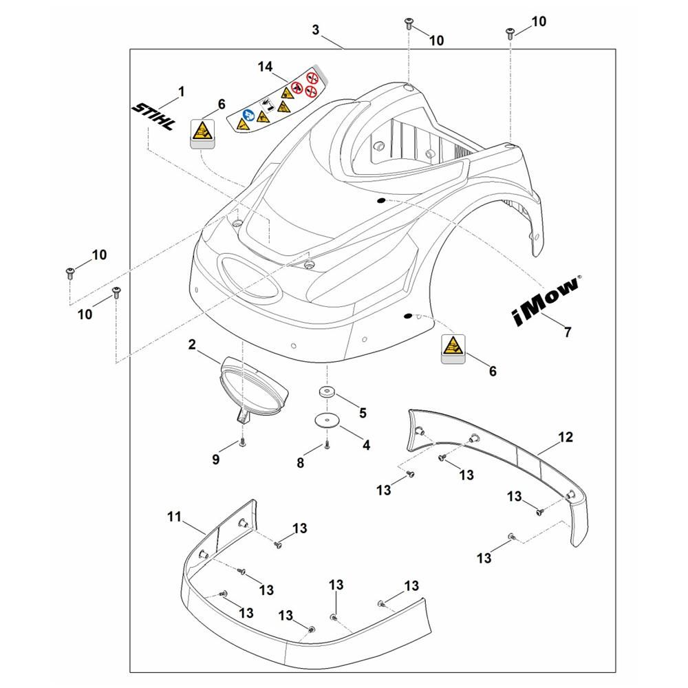 The Machine Cover Assembly for the Stihl RMI 422.0 PC Robotic Mower is designed to protect the mower's internal components from environmental elements. This genuine Stihl part ensures the mower operates efficiently by shielding it from dust, moisture, and debris. The assembly includes various protective elements tailored for the RMI 422.0 PC model.