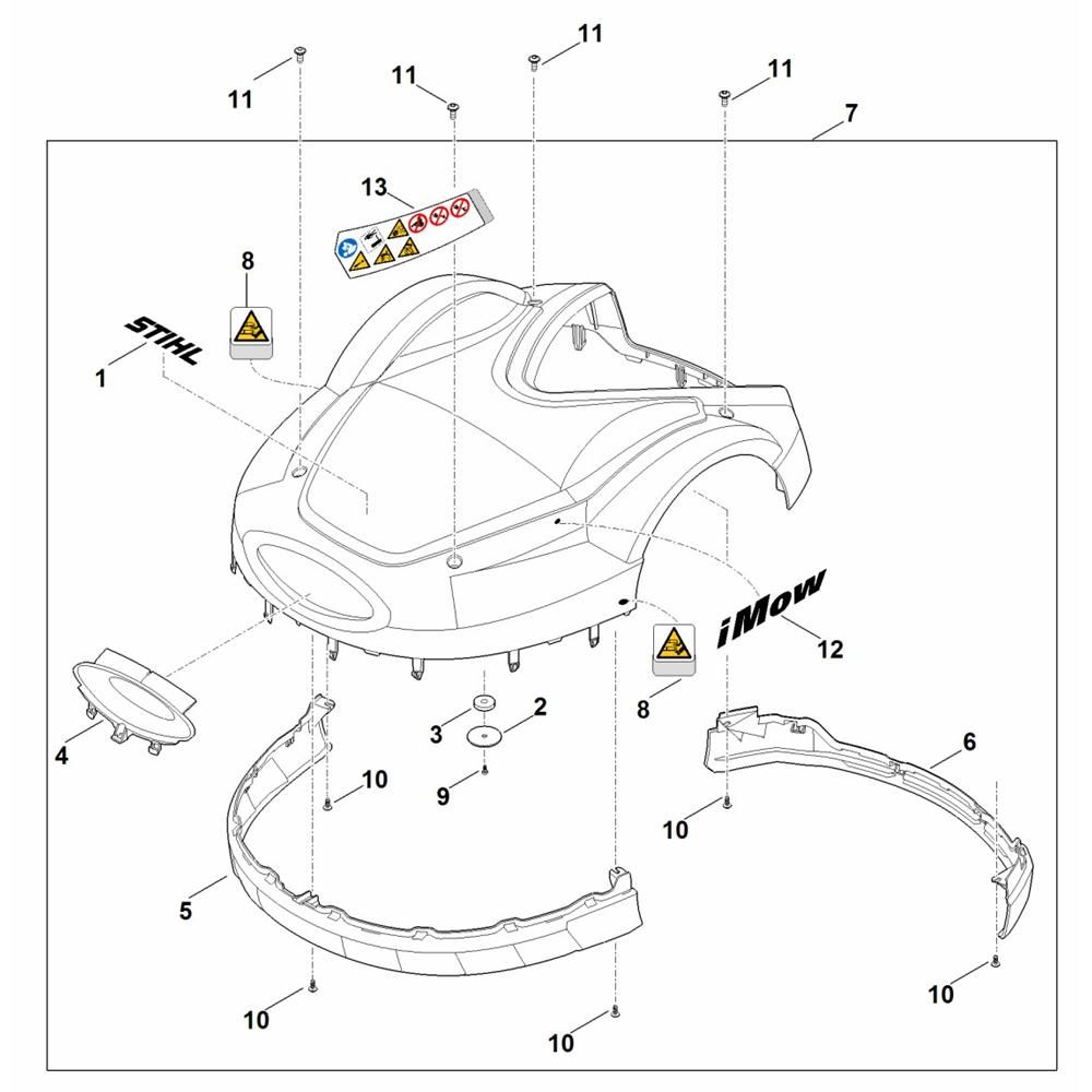 The Machine Cover Assembly for the Stihl RMI 632.0 PC Robotic Mower is designed to protect the mower's internal components from environmental elements. This assembly includes essential parts that ensure the mower operates efficiently by safeguarding it against dust, moisture, and debris. Genuine Stihl parts guarantee compatibility and durability, maintaining the mower's performance over time.