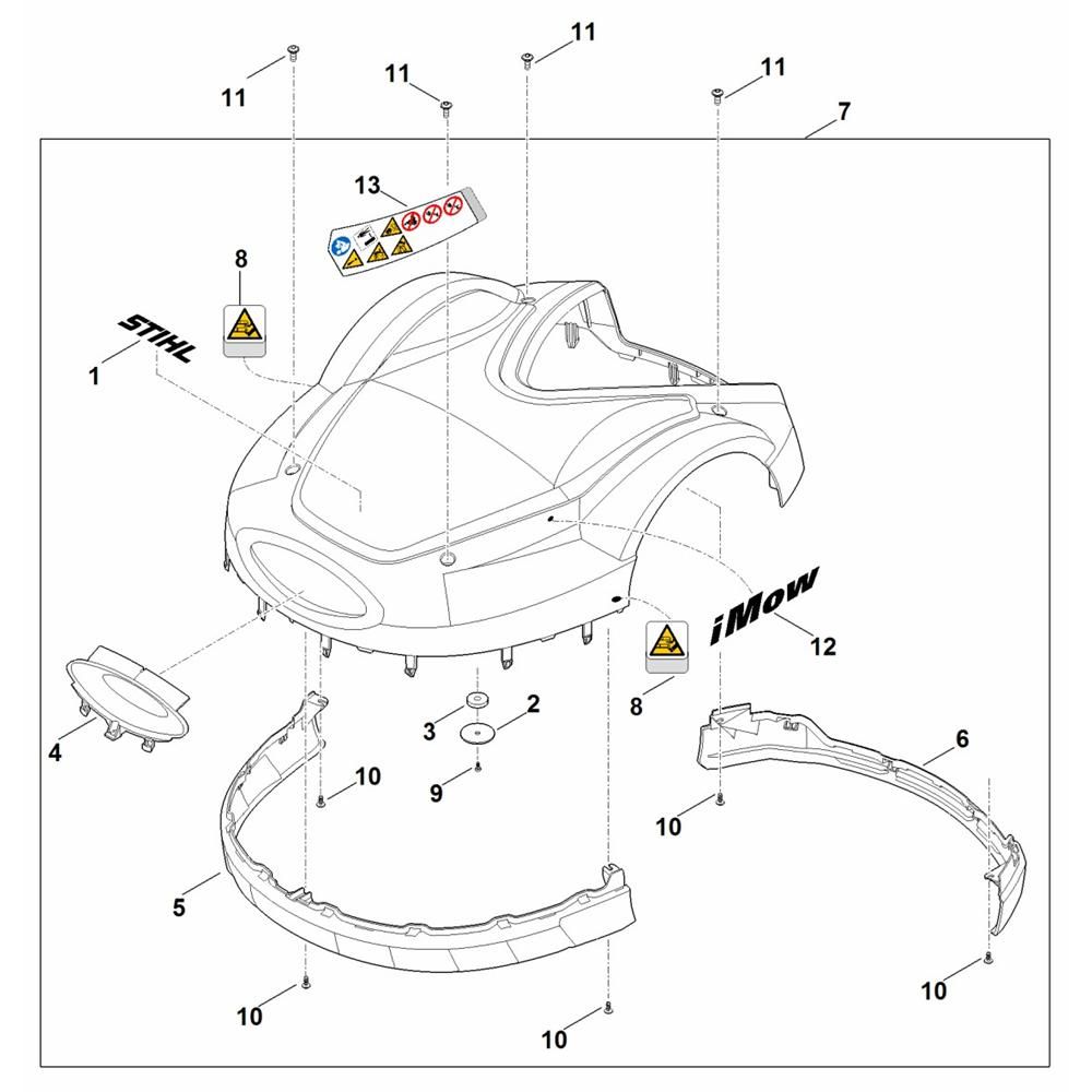 The Machine Cover Assembly for the Stihl RMI 632.0 Robotic Mower is designed to protect the mower's internal components from environmental elements. This assembly ensures the mower operates efficiently by shielding it from dust, moisture, and debris. It includes various parts such as protective panels and fasteners, tailored to fit the Stihl RMI 632.0 model perfectly.