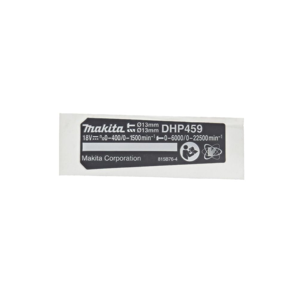 The Name Plate for Makita DHP459 Cordless Combi-Drill, with OEM No. 815B76-4, is a genuine Makita part designed to replace or update the identification plate on your drill. Crafted from durable materials, this name plate ensures that your tool remains easily identifiable and maintains its professional appearance. It is specifically designed for use with Makita's DHP459 and DHP459RFE models, ensuring a perfect fit and seamless integration with your existing equipment. This essential component helps maintain the authenticity and value of your Makita tools, making it an ideal choice for tradespeople and DIY enthusiasts alike.