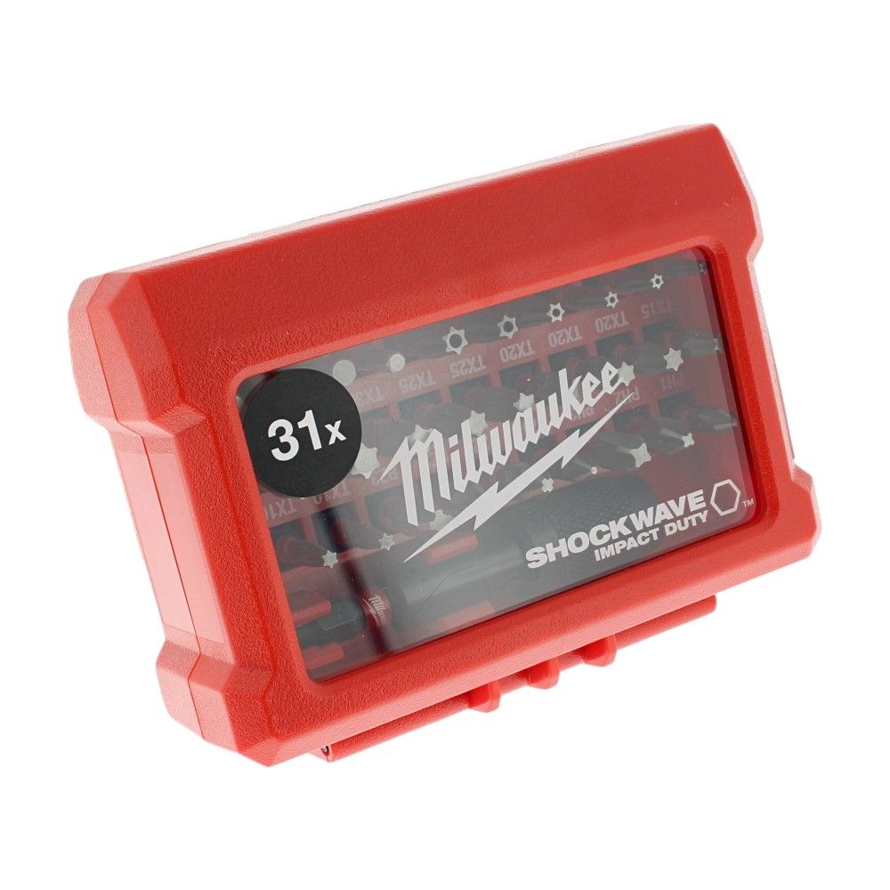 The Milwaukee S/Bit ShockWave CD Compact Set - 31 Pieces GBX is a genuine part from Milwaukee designed for impact driving and demanding fastening work. The set contains a versatile mix of Phillips, Pozidriv, Torx, and hex screwdriver bits made from hardened steel for long service life. Each bit is engineered for high torque use with SHOCKWAVE Impact Duty performance, featuring Wear Guard Tip and Shock Zone design to help reduce tip wear and breakage. Bits use the standard 1/4 inch (6.35 mm) hex shank for quick changes in impact drivers and drill drivers. A compact, durable red plastic case keeps the bits organised and protected for site work or the toolbox. Built for consistent grip and drive, this set supports accurate, efficient fastening across a wide range of materials.