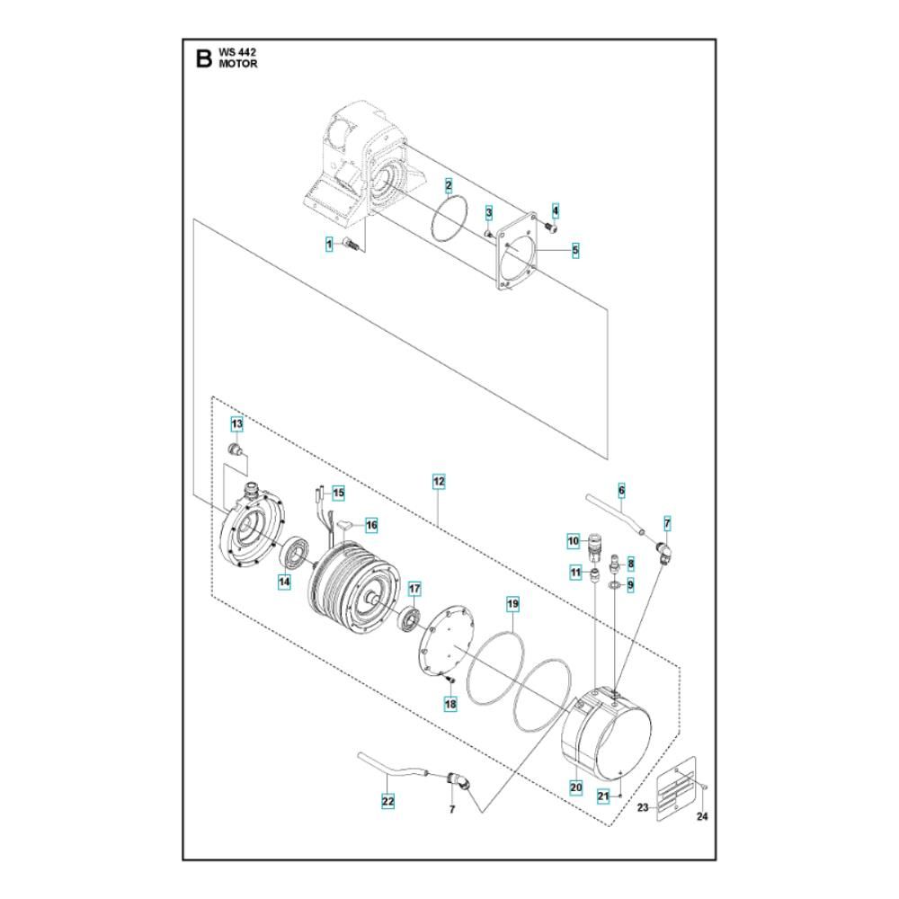 The Motor Assembly for the Husqvarna WS 442 HF Wall Saw is designed to ensure optimal performance and longevity. This assembly includes key components such as the motor housing, rotor, and stator, which work together to deliver efficient cutting power. Essential for maintaining the saw's reliability, these genuine Husqvarna parts help in reducing wear and tear during operation.