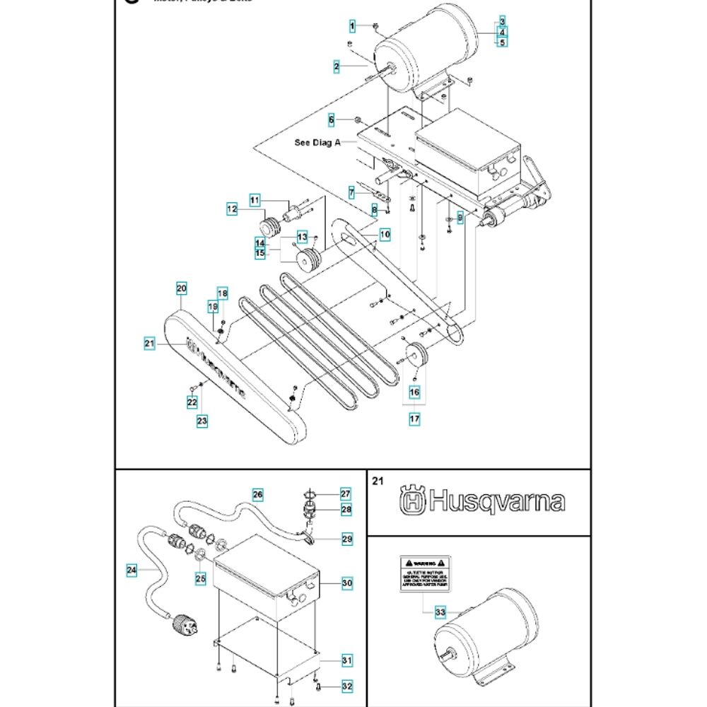 The Motor, Pulley & Belts Assembly for the Husqvarna MS 610 Masonry Saw includes key components to ensure optimal performance and longevity. This assembly is crucial for transferring power efficiently and maintaining the saw's cutting precision. Genuine Husqvarna parts are used, ensuring compatibility and reliability. Components such as belts, pulleys, and motor parts are included to support routine maintenance and repair.