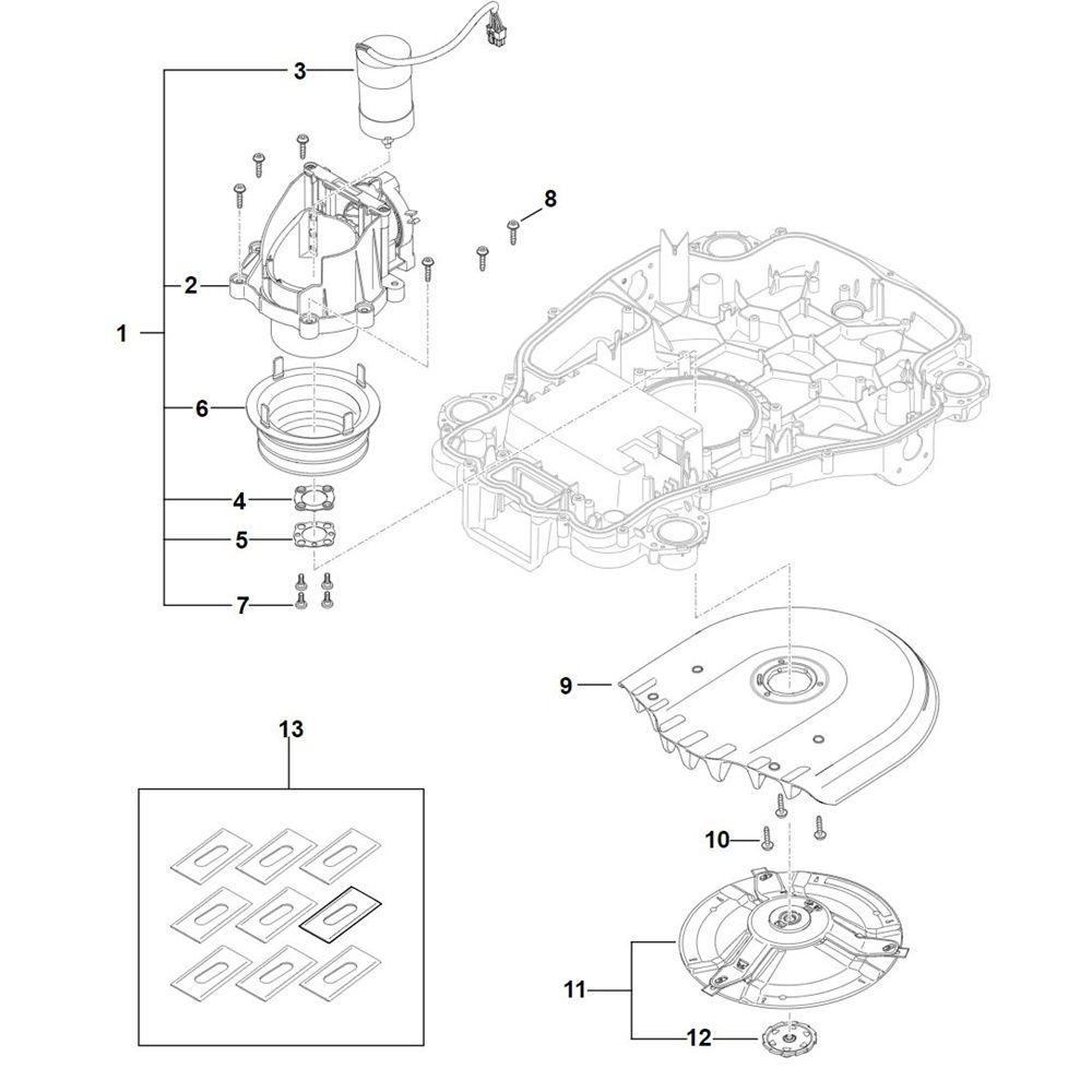 The Mowing Deck and Height Adjustment assembly for the Stihl iMOW 5.0 Robotic Mower ensures precise cutting and optimal performance. This assembly includes components that allow for easy adjustment of cutting height, enhancing the mower's efficiency across various terrains. Genuine Stihl parts guarantee compatibility and reliability for maintaining your robotic mower.