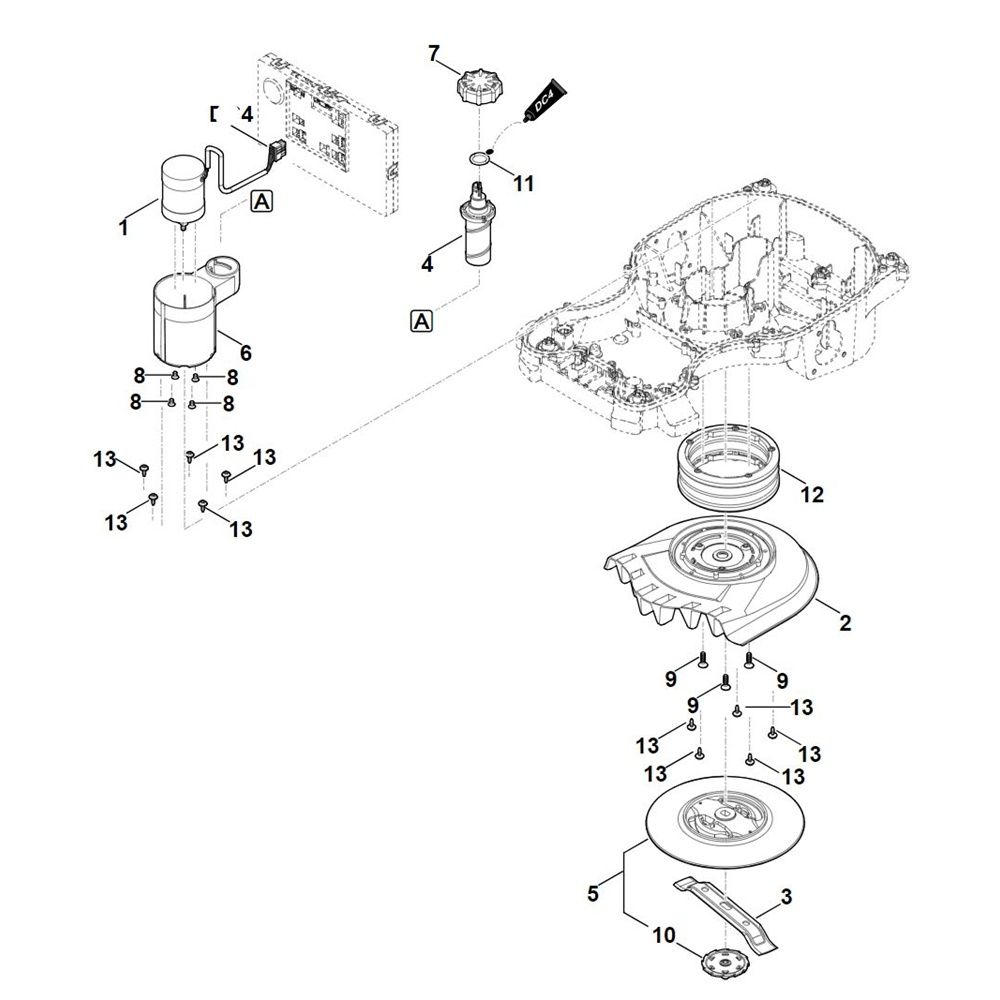 The Mowing Deck and Height Adjustment assembly for the Stihl RMI 422.1 Robotic Mower ensures optimal cutting performance and adaptability to various grass lengths. This assembly includes components like blades, height adjusters, and mounting brackets, designed to maintain the mower's efficiency and precision. Genuine Stihl parts guarantee compatibility and durability.