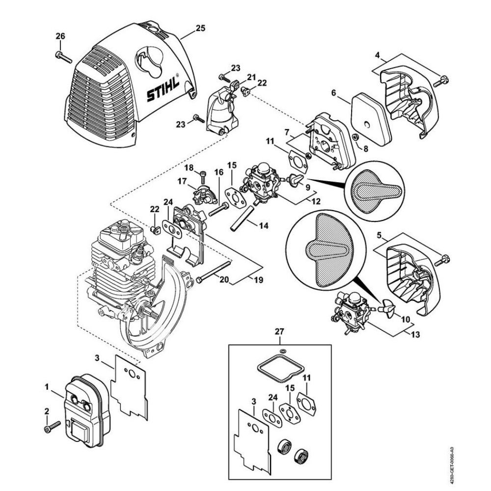 The muffler and air filter for the Stihl HL 95 Long Reach Hedge Trimmer are essential components for optimal performance. The muffler reduces noise and emissions, while the air filter ensures clean airflow to the engine, preventing dust and debris damage. These genuine Stihl parts are designed for durability and efficiency, maintaining the trimmer's reliability.