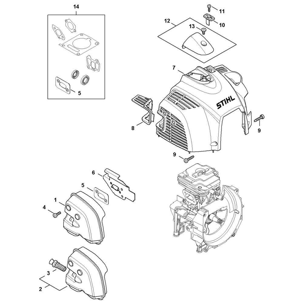 The Muffler and Shroud Assembly for the Stihl FS361C Clearing Saw includes key components to ensure optimal performance and durability. This assembly helps manage exhaust emissions and protects the engine from debris. Genuine Stihl parts are designed for precise fit and function, contributing to the longevity of your equipment.