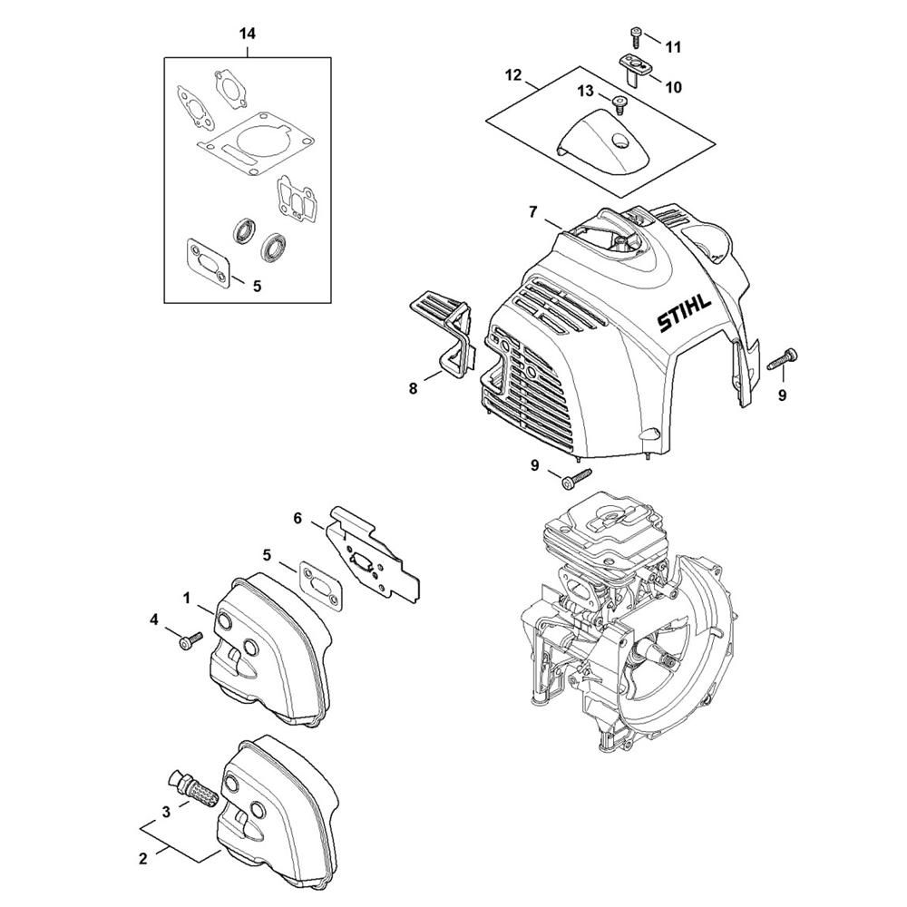 The Muffler and Shroud Assembly for the Stihl FS461 C-EM Clearing Saw includes essential components to ensure optimal performance and longevity. This assembly aids in noise reduction and heat dissipation, protecting the engine during operation. Genuine Stihl parts ensure compatibility and reliability, supporting efficient clearing tasks.