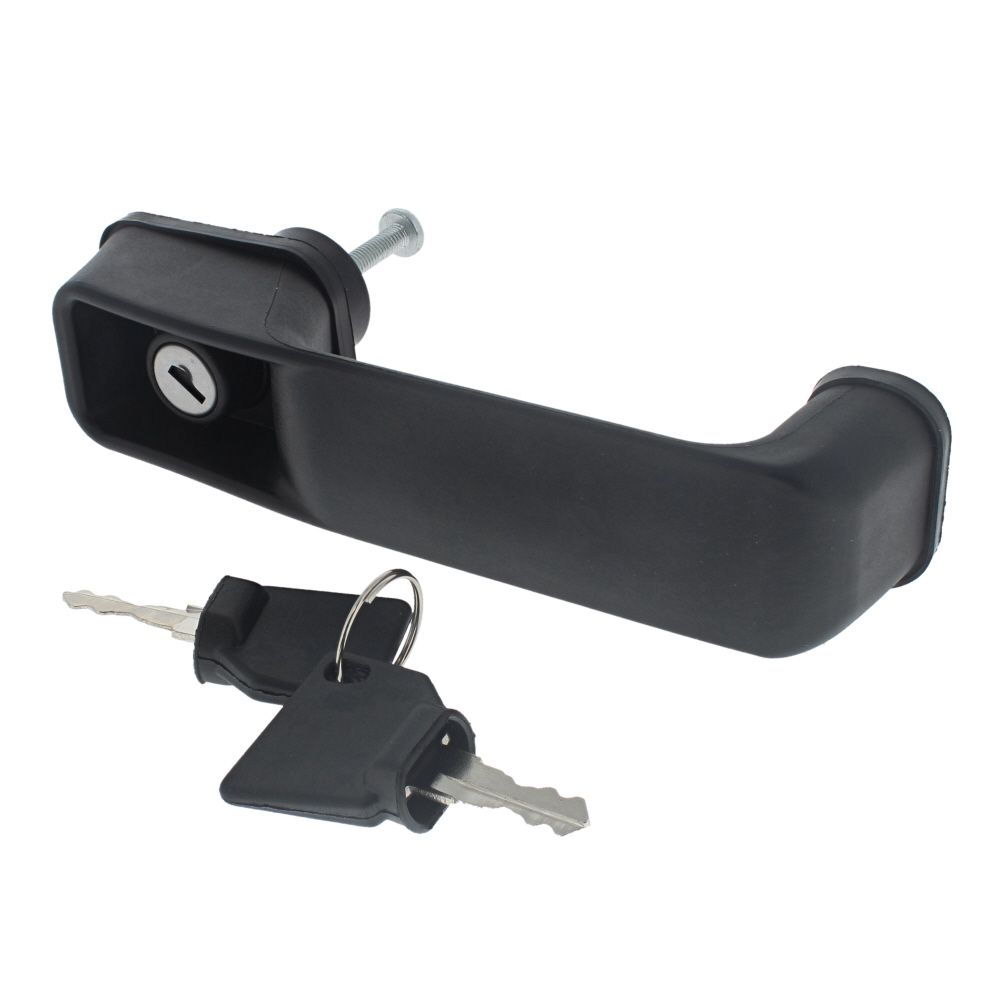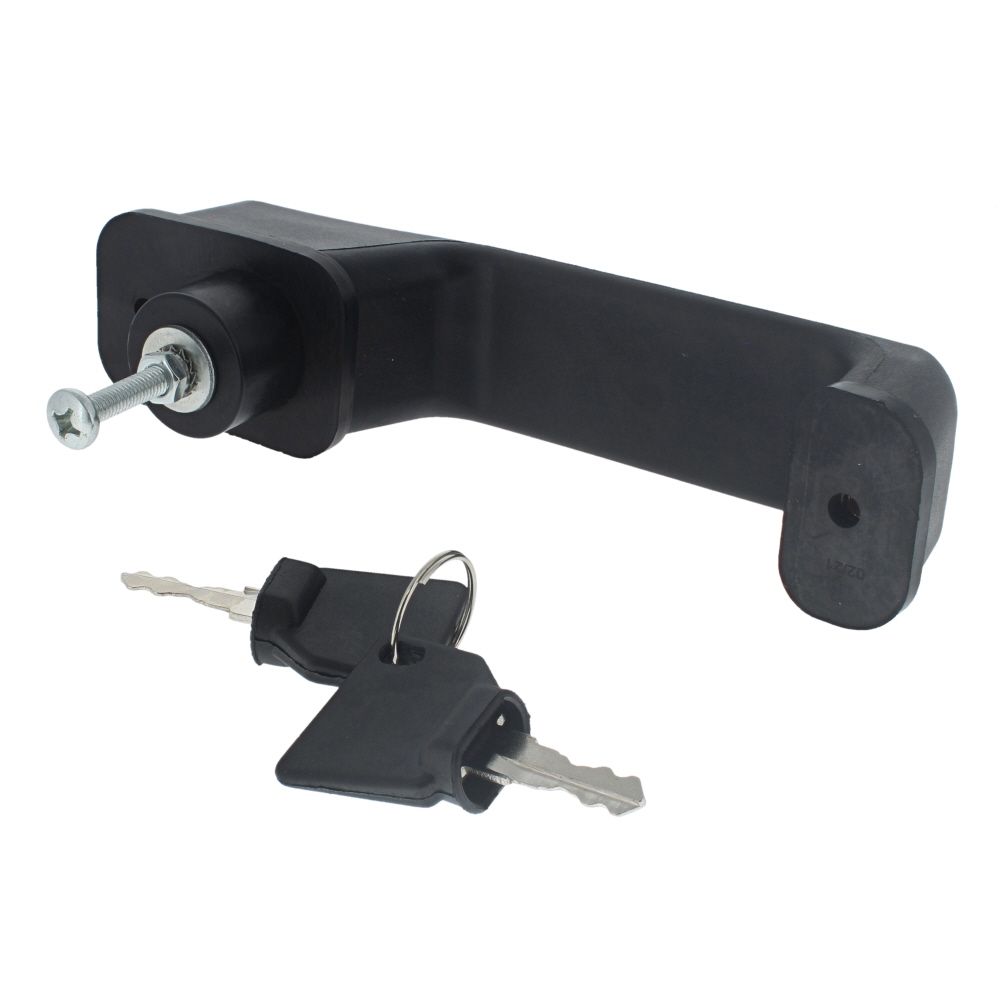 The Door Handle for JCB machines is a durable, black exterior cab handle designed to restore smooth, secure access to your loader or excavator. Built with a hard‐wearing polymer body and metal latch components, it stands up to mud, weather, and day‐to‐day site use. This Non Genuine Part replaces OEM part number 123/04067 and is suitable for popular models such as the JCB 3CX 14H5NA and 3CX 14L5NA. It offers a reliable fit and a comfortable grip, helping to keep the operator's door operating cleanly and consistently. Ideal for routine maintenance or replacing a worn or broken handle, it provides a practical, cost‐effective way to maintain cabin access and machine uptime without compromising on reliability.