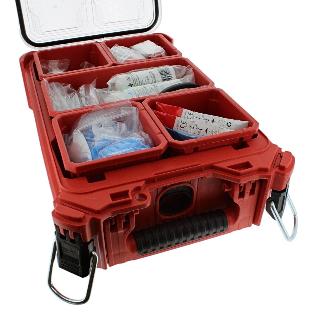 Milwaukee PACKOUT workplace first aid box, site first aid kit, BS 8599-1 compliant first aid kit, PACKOUT medical organiser, first aid storage organiser, jobsite first aid case.