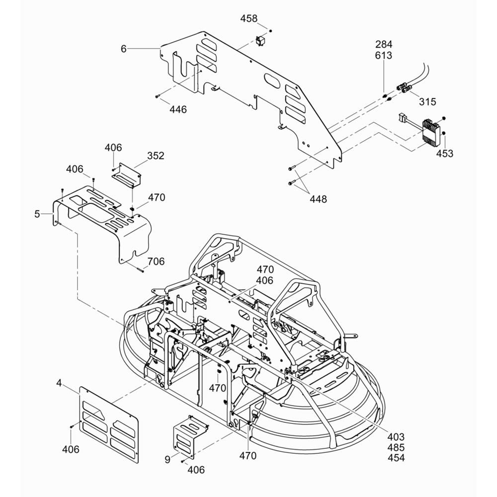 The Panel Assembly for the Wacker CRT 36-24 Trowel includes essential components to ensure optimal operation of the ride-on trowel. Designed for durability and performance, this assembly helps maintain the machine's efficiency in smoothing and finishing concrete surfaces. Components may include control panels, switches, and wiring harnesses, all crucial for seamless operation.