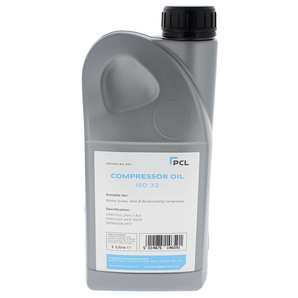 PCL Compressor Oil ISO32 1 Litre (ISO321L) is a premium-grade lubricating oil for air compressors and pneumatic systems. Formulated to the ISO VG 32 viscosity grade, it delivers stable film strength to protect bearings, rotors, pistons, and vanes under typical workshop and site conditions. It helps reduce friction, manage heat, and resist oxidation and corrosion for dependable, long-term operation. Supplied in a convenient 1 litre bottle (approximately 1.76 pints), it suits many fixed and portable compressors that specify ISO 32 oil. Ideal for routine maintenance on plant, garage, and DIY units, this PCL oil supports smooth running and consistent air delivery across a range of pneumatic tools and equipment. Always check your machine's handbook to confirm ISO 32 is the correct grade.
