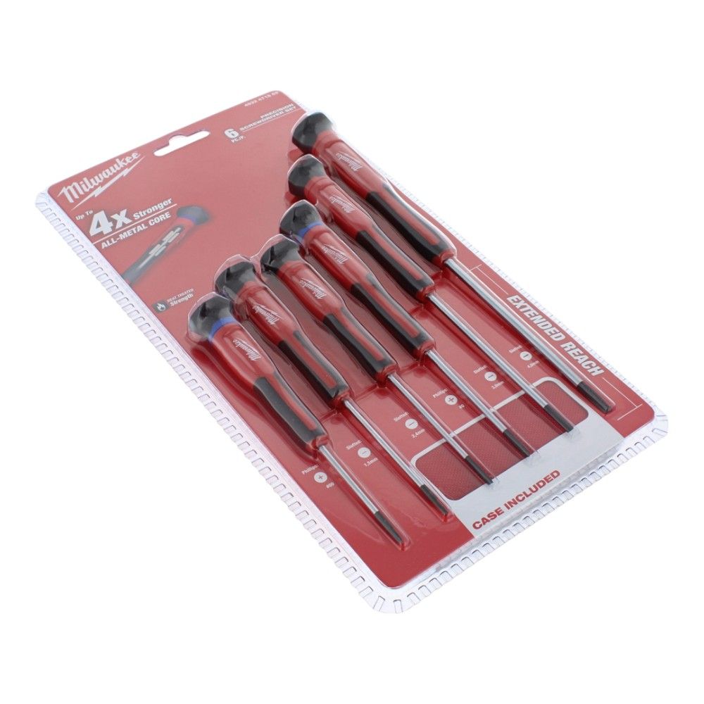 The Milwaukee Precision Screwdriver Set - Pack of 6 is a genuine Milwaukee tool set designed for accurate, controlled work on small fasteners found across construction equipment, power tools, and garden machinery. Each driver features an all‐metal core for strength and chrome‐plated shanks that resist corrosion, supporting long service life in workshop and site conditions. A 360° rotating back cap allows fingertip control for steady, precise turning, while longer shanks improve visibility and reach in tight housings and around compact components. Supplied in a durable zipped case for safe storage and transport, this set helps with detailed tasks such as assembling, adjusting, and maintaining machines and tools. Genuine Milwaukee Part (OEM 4932471869). Suitable for tradespeople, maintenance teams, and DIY users who need dependable precision drivers.