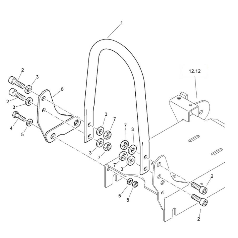 The Protection Bow Assembly for the Bomag BVP12/50 Forward Compactor is designed to safeguard the machine during operation. This genuine Bomag part ensures durability and reliability, essential for maintaining the compactor's performance. The assembly includes components like brackets and fasteners, providing comprehensive protection against impacts and wear.