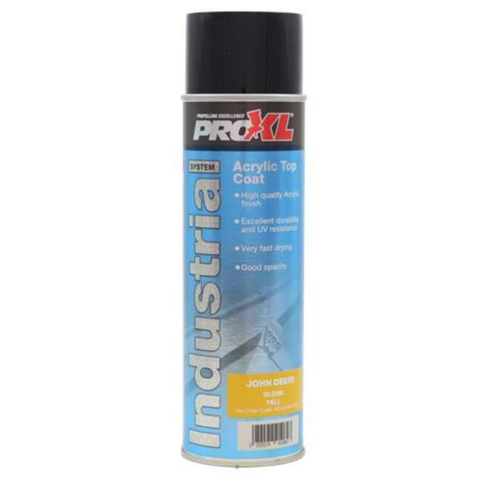 The RAL 1018 Proxl Industrial Acrylic Topcoat Aerosol in John Deere Yellow is a 500 ml industrial spray paint for touch-up and maintenance on construction and garden machinery. Formulated with hard-wearing acrylic, it delivers strong adhesion to properly prepared substrates and dries quickly to a clean, even topcoat. It is suitable for metal panels, frames, mower decks, guards, implements, and attachments commonly found on tractors, ride‐on mowers, excavators, loaders, and compact equipment. The RAL 1018 colour match helps maintain a consistent John Deere Yellow finish across repairs and new parts, supporting a professional appearance in the workshop or on site. The can's smooth spray action makes it practical for both tradespeople and DIY users working on small areas or broader panels.