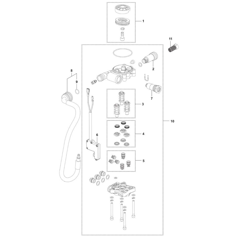 The Pump Assembly for the Husqvarna PW 240 Pressure Washer is designed to ensure optimal performance and longevity. This assembly includes key components that facilitate efficient water flow and pressure regulation, essential for effective cleaning. Genuine Husqvarna parts help maintain the reliability and durability of your pressure washer.