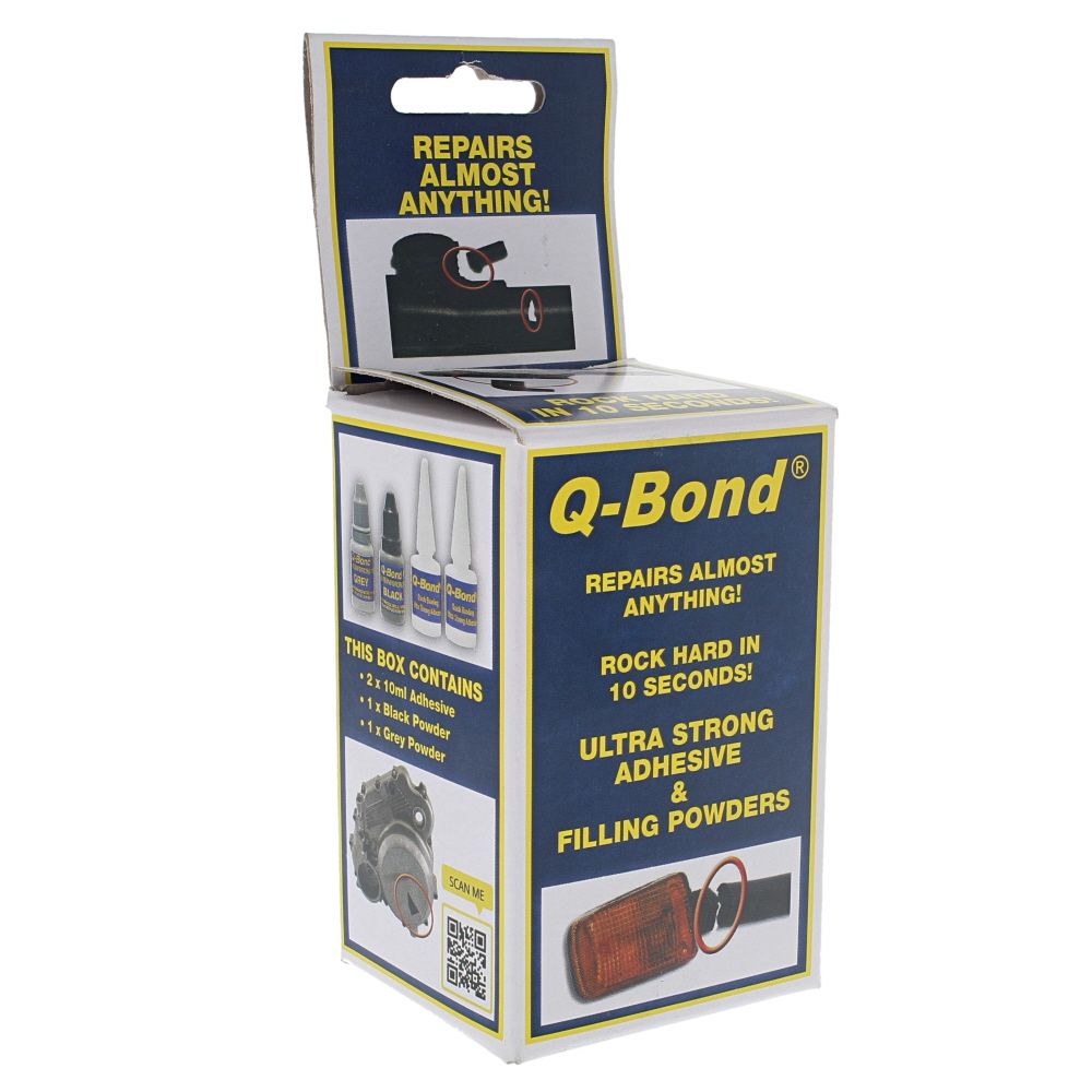 The Q Bond Ultra Strong Adhesive System - Repair Kit is a compact cyanoacrylate-based repair kit designed for quick, durable fixes on construction and garden machinery. It combines a 10 ml bottle of high-quality cyanoacrylate adhesive with black and grey reinforcing powders to bond and rebuild cracks, holes, and gaps. The adhesive cures in around 10 seconds to form a hard, permanent bond that is resistant to petrol and oil, and tolerant of heat up to 180°C (356°F). Use it to restore plastic housings, guards, covers, and small metal components on equipment such as lawn mowers, chainsaws, strimmers, generators, pressure washers, and compactors. The kit is straightforward to use on site or in the workshop by both tradespeople and DIY users.