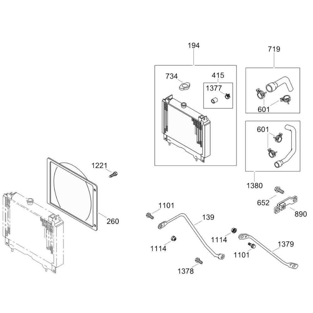 The Radiator Assembly for the Wacker CRT 48-34 Trowel is designed to ensure optimal cooling and performance of the ride-on trowel. This assembly includes key components such as the radiator core, hoses, and clamps, which work together to dissipate heat effectively. Regular maintenance of these parts helps in preventing overheating and prolonging the life of the machine.