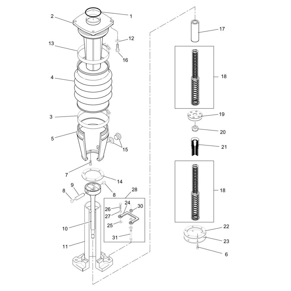 The Ramming System Assembly for the Wacker BS500-4 Trench Rammer is designed to ensure optimal performance and durability. This assembly includes key components such as pistons, springs, and seals, which work together to deliver powerful compaction in trenching applications. Genuine Wacker Neuson parts ensure compatibility and reliability, maintaining the machine's efficiency and longevity.