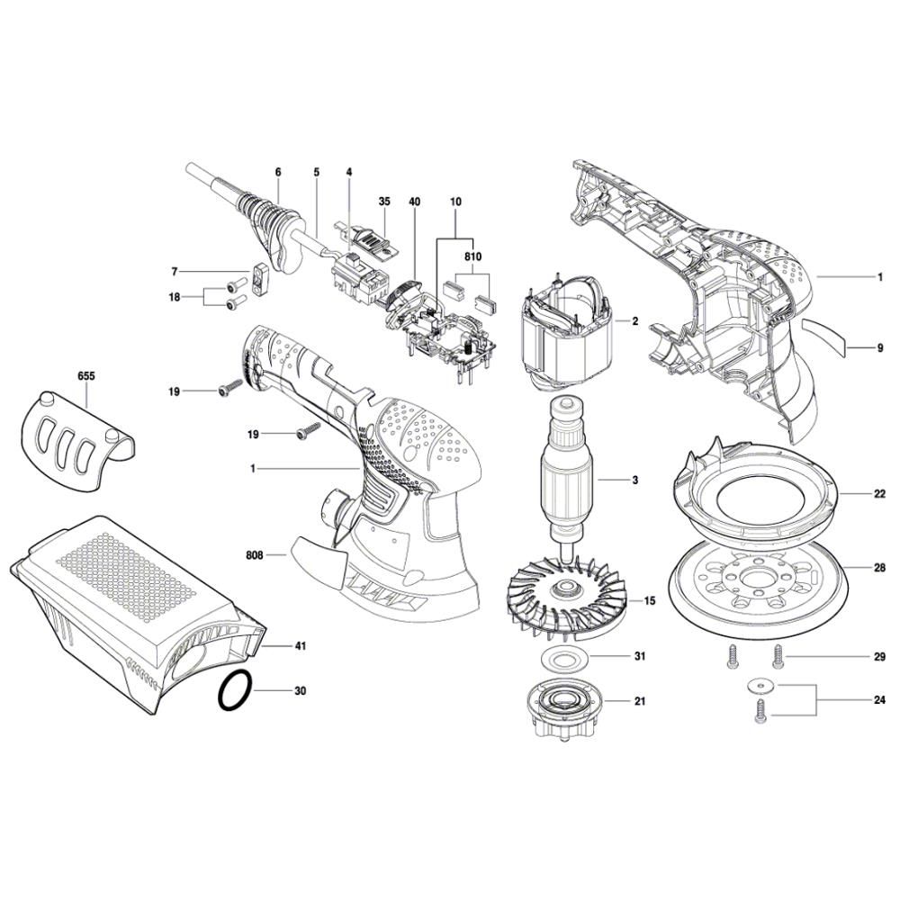 The Random Orbital Sander Assembly for Bosch PEX 300 AE includes genuine Bosch spare parts essential for maintaining optimal performance. This assembly ensures smooth operation and longevity of your sander by providing components such as pads, bearings, and dust bags. Ideal for routine maintenance and repair, it helps achieve professional sanding results.