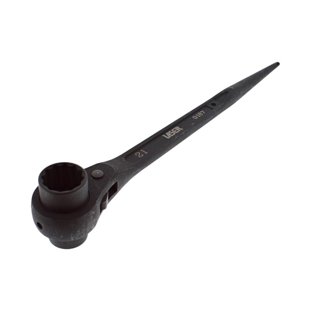 Introducing the Ratchet Podger Spanner, a must-have tool for professionals in the scaffolding and construction industries. This twin-sized spanner features a 17mm and 21mm Bi-Hex (12pt) ratchet head, designed to speed up the assembly process. Its long, tapered shaft ensures the easy alignment of component holes, saving you time and effort on the job. The spanner is precision engineered to ANSI and DIN standards and is crafted from chrome vanadium for maximum durability. It's coated with a black phosphate finish for additional resilience and a sleek look. Additionally, there's a hole for safety cord attachment, enhancing its practicality and safety in high-risk environments.