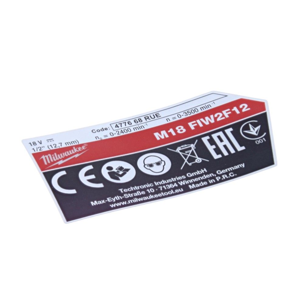 The Rating Plate for Milwaukee Machines is a genuine spare part designed to ensure the proper identification and specification display for your Milwaukee equipment. Made from durable materials, this rating plate is specifically crafted for the Milwaukee M18FIW2F12 model, providing a clear and lasting display of essential machine information. As a crucial component for maintaining compliance and operational standards, this rating plate helps in the easy identification of your machine's specifications, making it indispensable for both professional tradespeople and DIY enthusiasts.