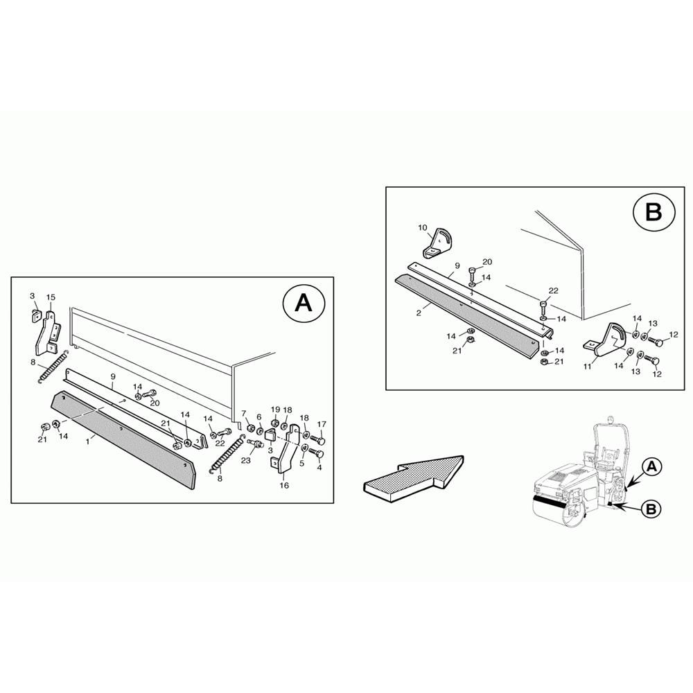 The Rear Scraper Assembly for the Wacker RD25 Roller is designed to maintain optimal performance by removing debris and ensuring smooth operation. This assembly includes genuine Wacker Neuson parts, crucial for the effective functioning of the tandem roller. It helps in prolonging the life of the roller by preventing material build-up and ensuring consistent surface contact.