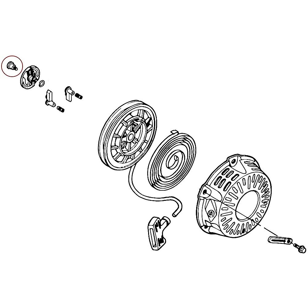 Starter centre screw, pull-start centre bolt, recoil starter fixing screw, starter pulley retaining bolt, starter hub screw, recoil starter retention bolt.