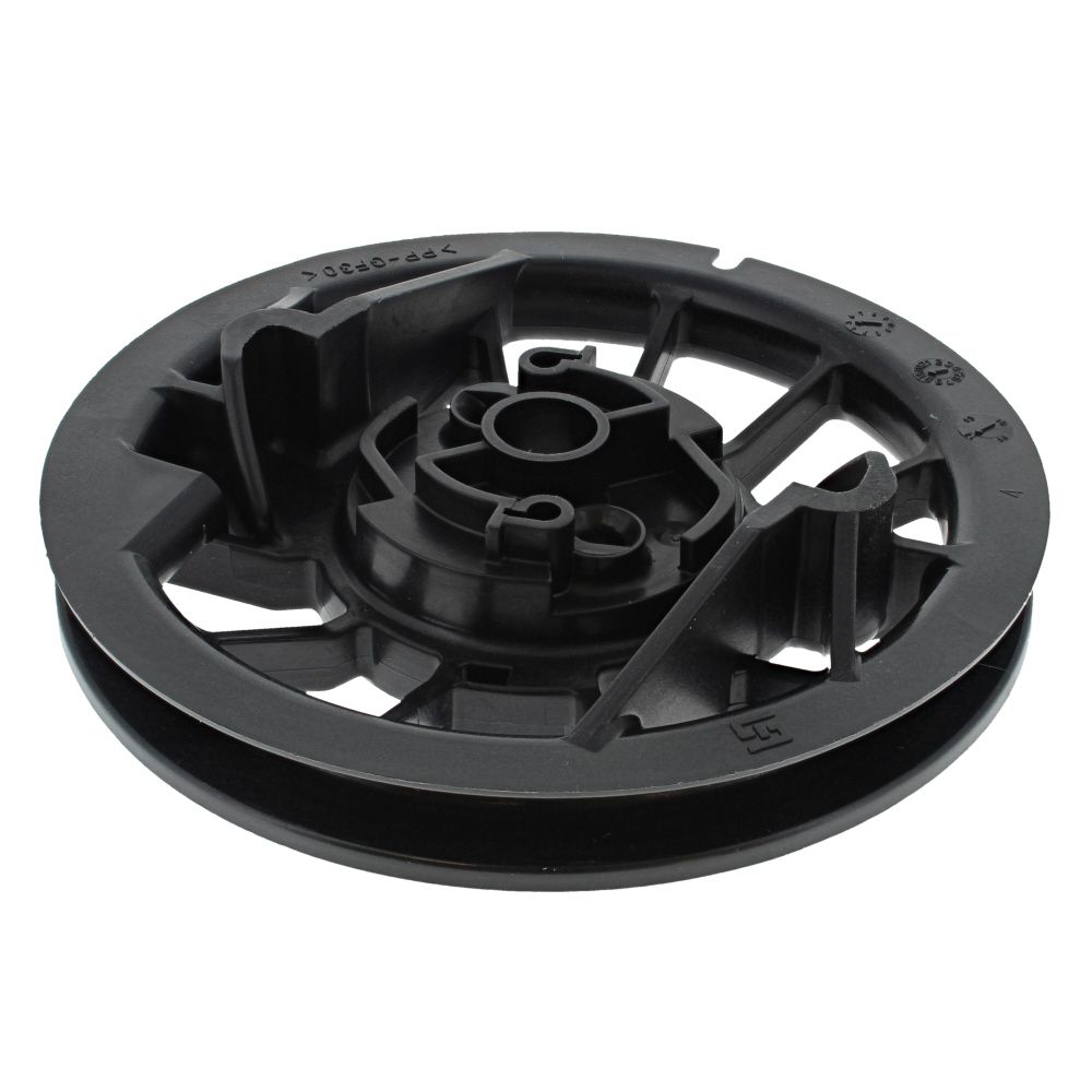 Starter pulley, pull start pulley, engine recoil pulley, recoil start spool, starter rope pulley, rope rotor. These names describe the same rotating component that houses and guides the starter rope within the recoil starter assembly on Honda GX engines.