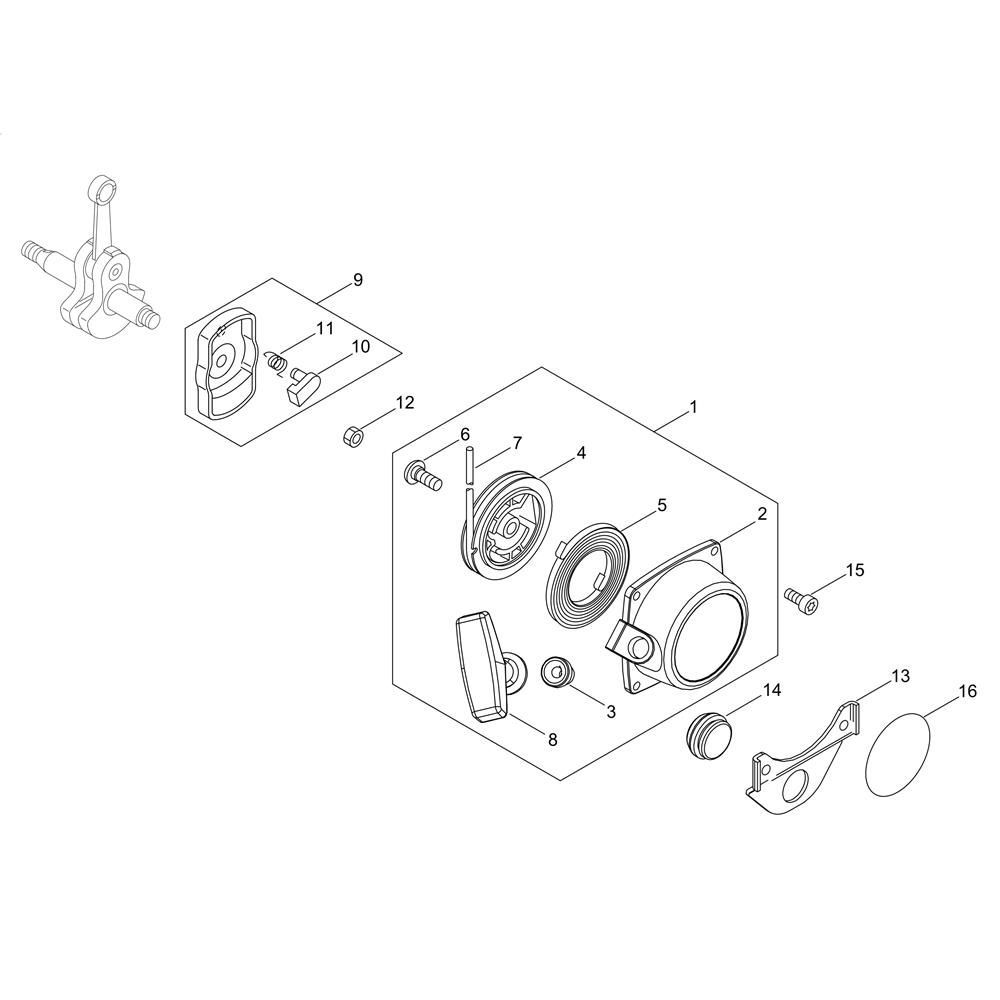 The Recoil Starter and Pulley for the Shindaiwa EB250 Blower are essential components designed to ensure efficient engine start-up and operation. These genuine Shindaiwa parts are crafted to fit perfectly and provide reliable performance. The assembly includes key elements like the starter rope, pulley, and housing, all crucial for smooth and consistent engine ignition.