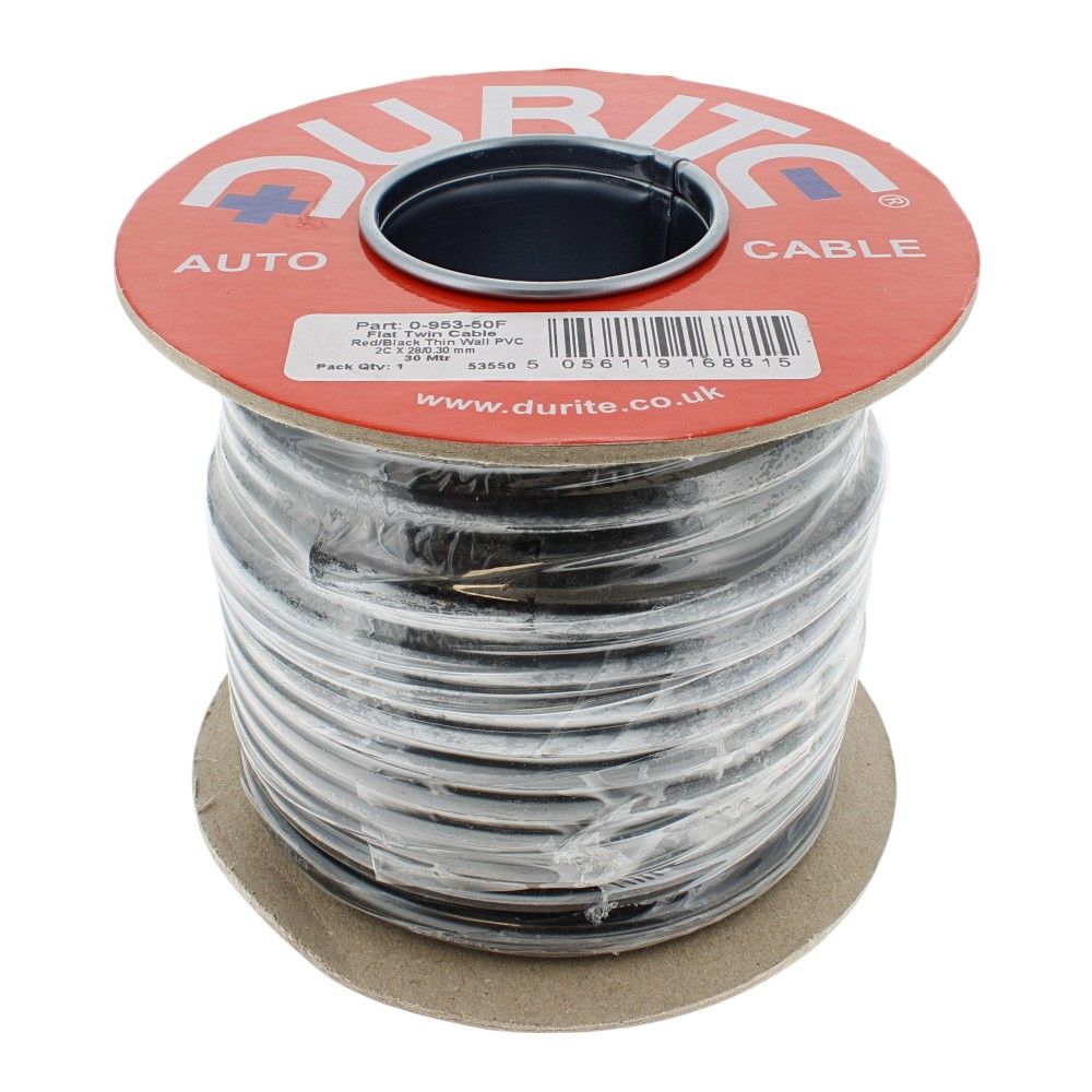 The Red/Black Flat Twin-Core Thin-Wall PVC Auto Cable - 2 x 2mm x 30m is a high-quality, genuine Durite part designed for automotive and machinery applications. Made from durable PVC, this cable features a twin-core design with a thin-wall construction, ensuring flexibility and ease of installation. It is ideal for use in various electrical systems, providing reliable power transmission. With a nominal outer diameter of 6.1 x 3.5mm, this cable is suitable for tight spaces and conforms to BS6862/ISO6722:2006 Class B standards, ensuring safety and performance.