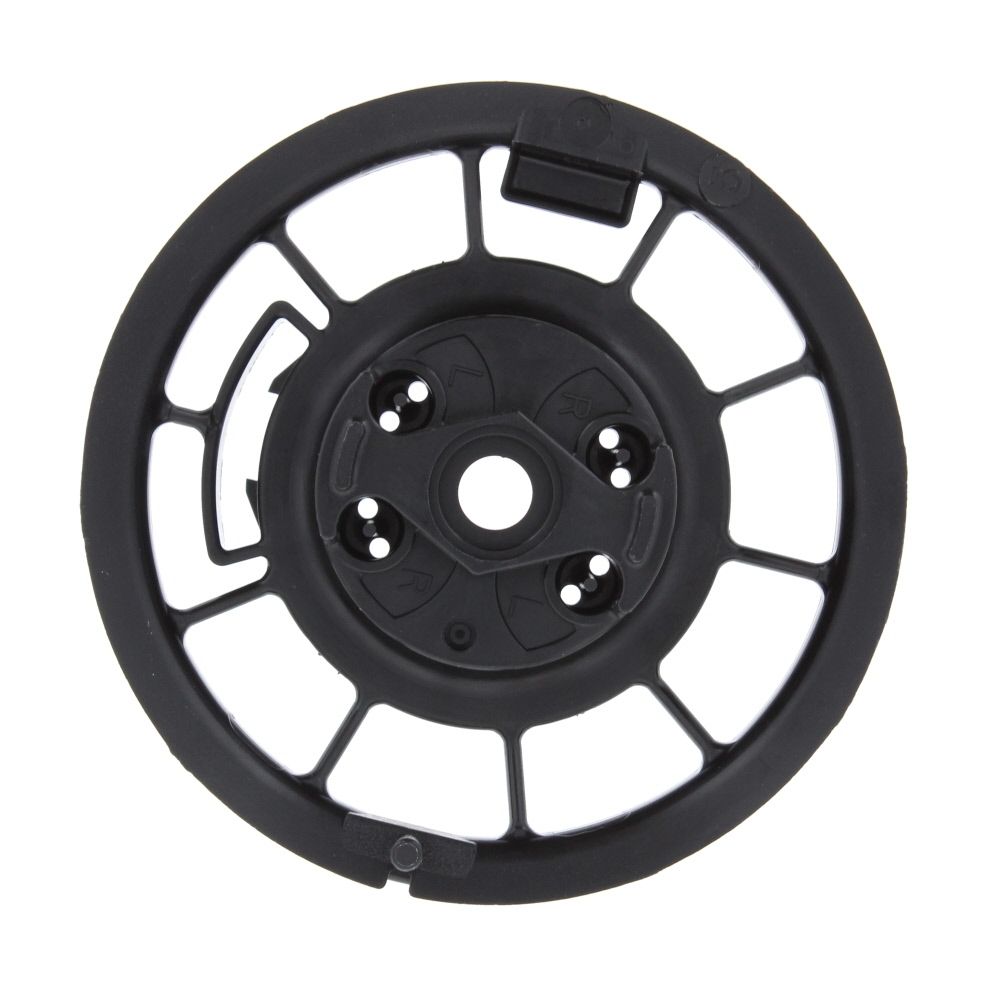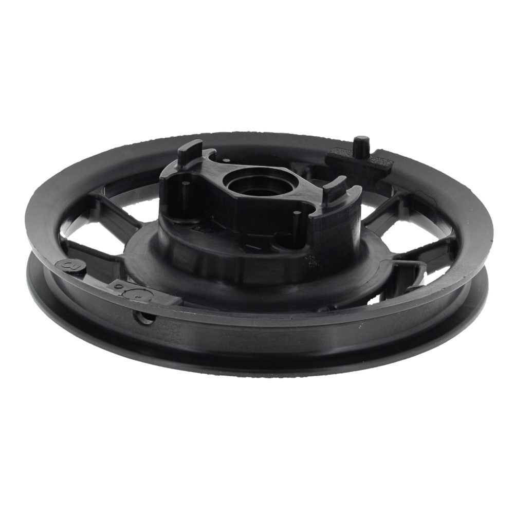 Pull-start spool, rewind starter pulley, starter cord drum, recoil rope rotor, recoil spool, cord pulley, starting rope wheel.