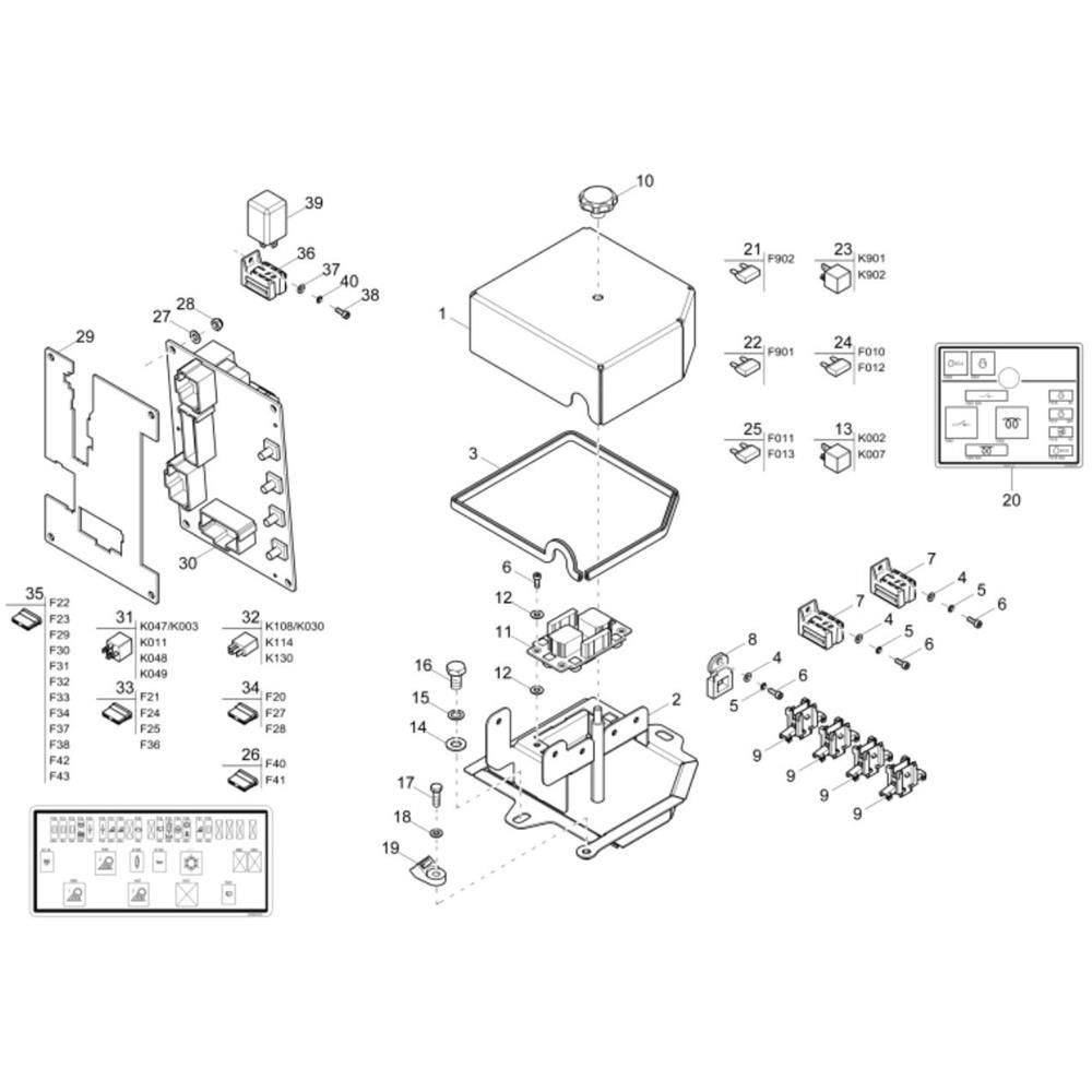 The Relay Box (904J-E36TA) Assembly is designed for the Wacker ET145 Mini Excavator, ensuring optimal electrical performance. This assembly includes various components that manage and distribute electrical power efficiently, safeguarding the excavator's systems. Genuine Wacker Neuson parts ensure compatibility and reliability.