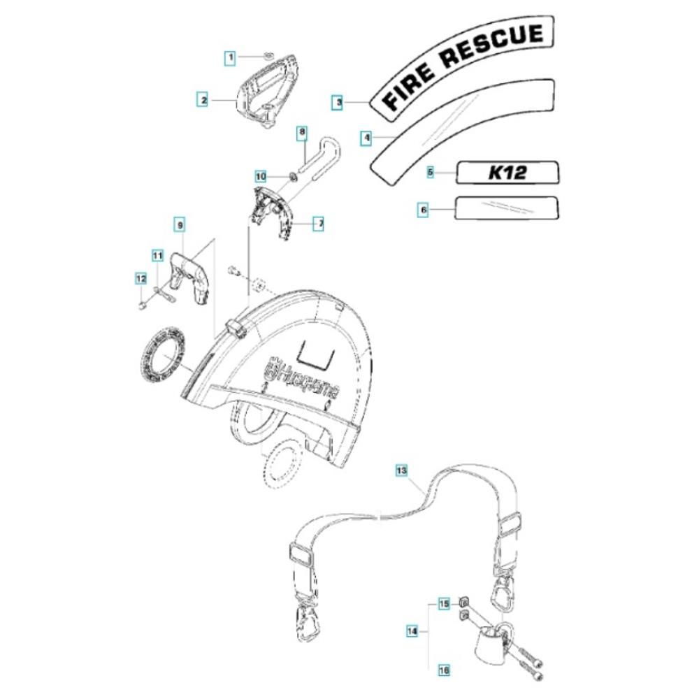 The Rescue Assembly for the Husqvarna K770 Rescue Disc Cutter includes essential components to ensure optimal performance during demanding cutting tasks. This assembly is designed to maintain the cutter's efficiency and reliability. Key components may include belts, pulleys, and guards, all contributing to the machine's durability and safety.