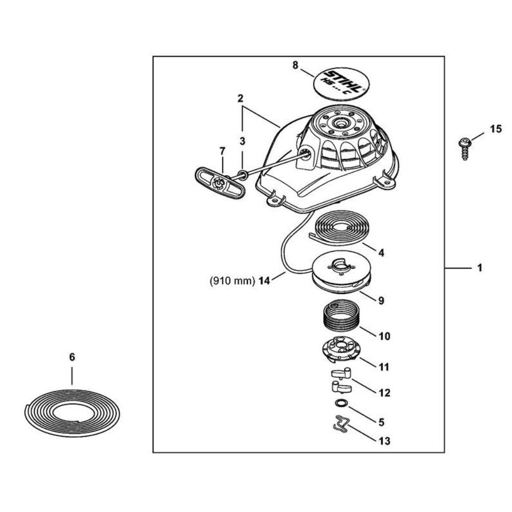 The Rewind Starter ErgoStart/Easy2Start is designed for the Stihl HS 56 and HS 56 C Hedge Trimmers, ensuring efficient and reliable starting. This genuine Stihl component is essential for maintaining the performance of your hedge trimmer. The assembly includes key parts like springs, pulleys, and cords, which are crucial for smooth operation and durability.