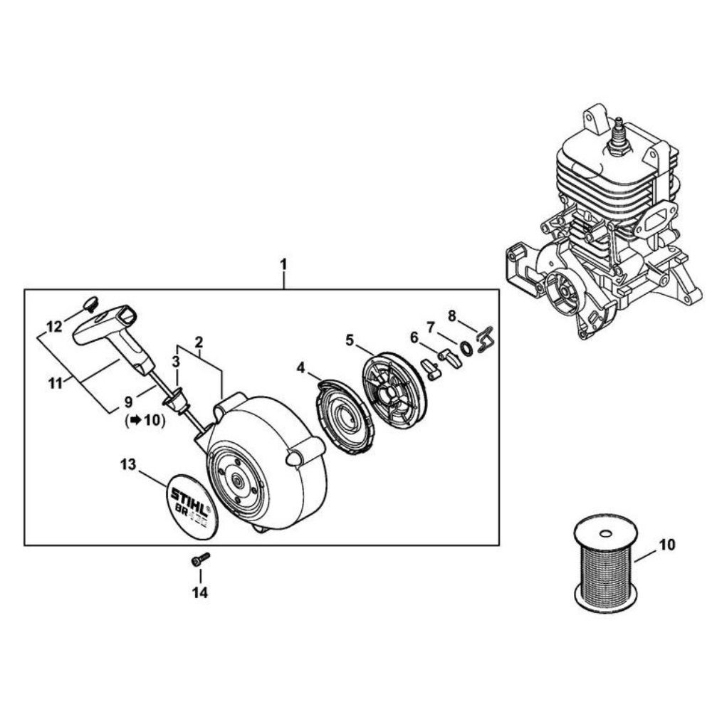 The Rewind Starter for the Stihl BR 430 Leaf Blower is essential for reliable engine ignition. Designed to ensure smooth starting, it includes components like the recoil spring and pulley. This starter assembly helps maintain efficient operation and prolongs the life of your blower. Available in genuine and non-genuine parts to suit various maintenance needs.