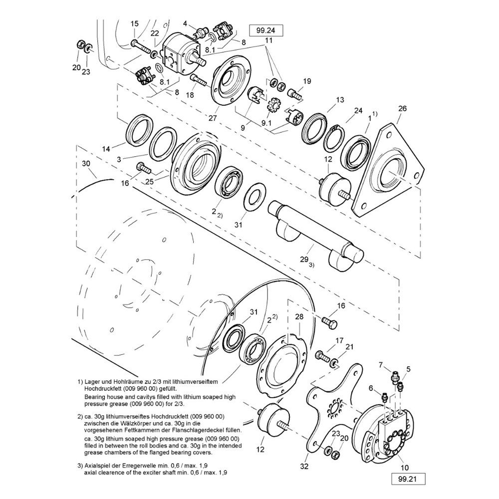 The Roller Drum Assembly for the Bomag BW80 ADS Roller includes key components essential for the machine's vibratory function. This assembly ensures smooth operation and effective compaction on various surfaces. Genuine Bomag parts are used to maintain reliability and performance. Components may include drums, bearings, and seals, tailored for optimal machine efficiency.