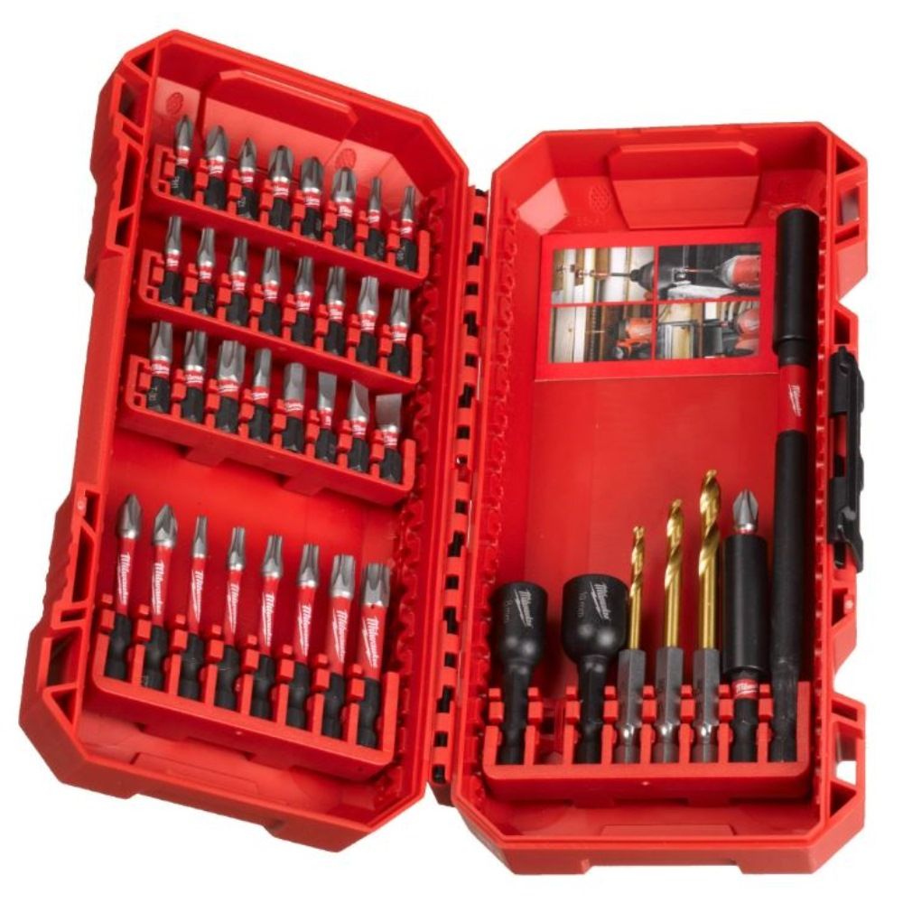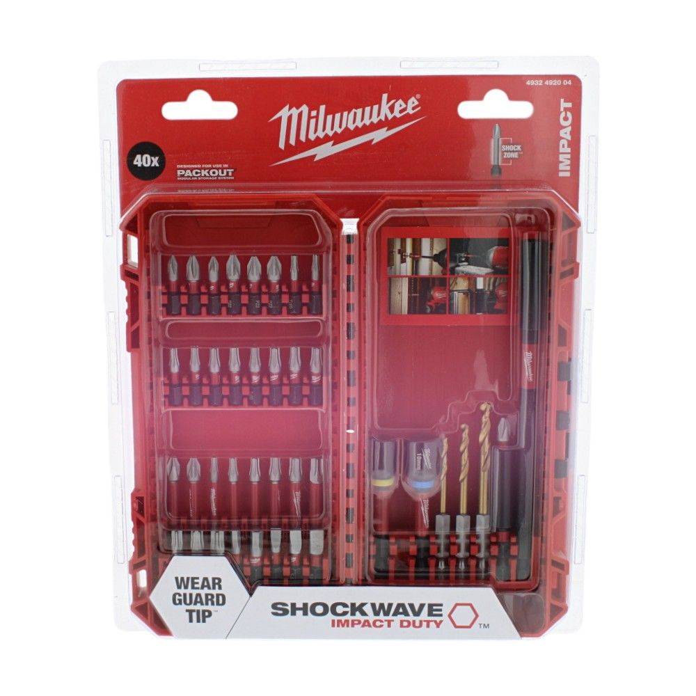 Milwaukee SHOCKWAVE 40 Piece Screwdriver Bit Set; SHOCKWAVE Impact Duty 40pc bit kit; 40-piece driver and drill bit assortment; 1/4 in (6.35 mm) hex impact bit set; Milwaukee 4932492004 driver bit set.