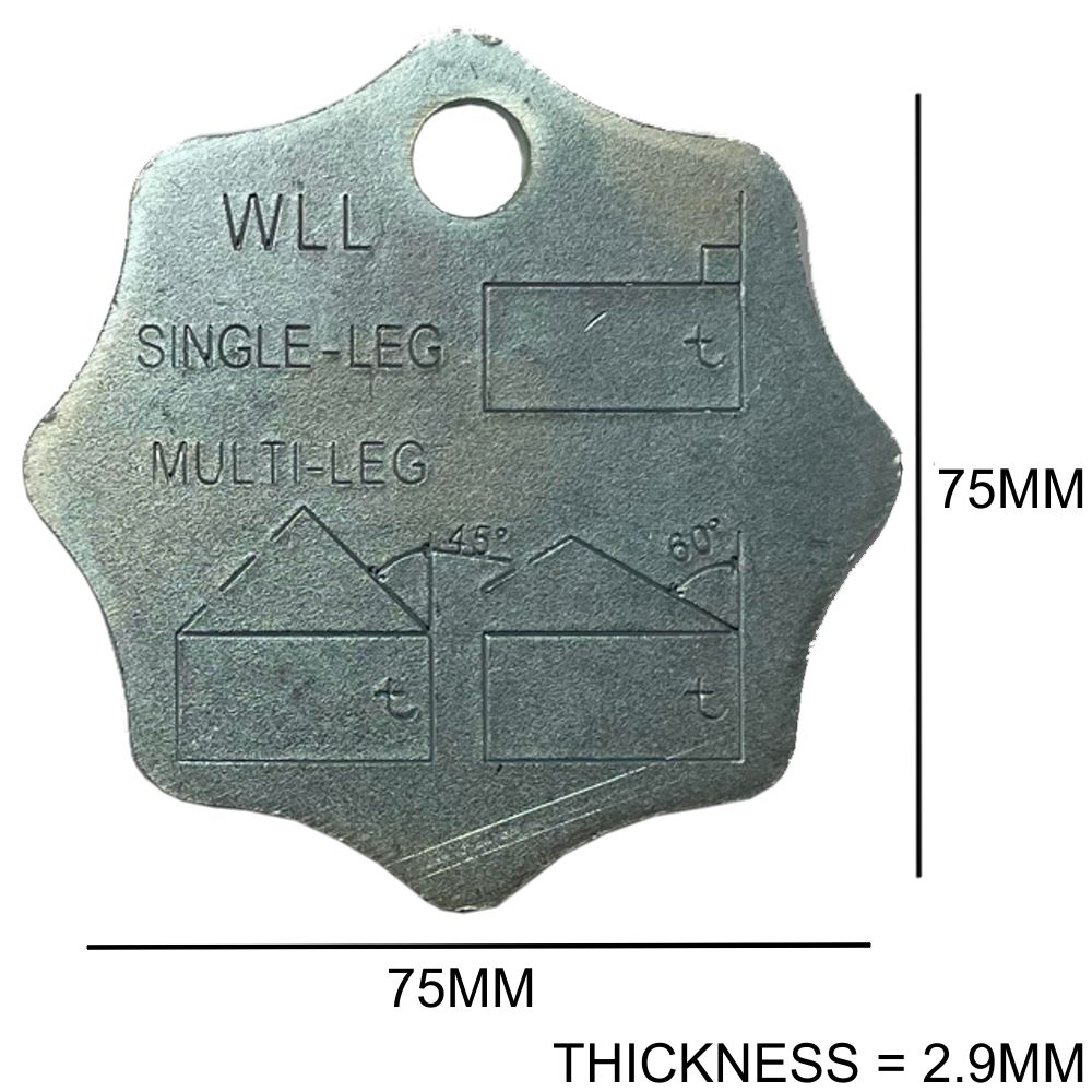 Chain label, S.W.L. tag, load rating tag, W.L.L. tag, lifting gear identification tag, metal rating tag, star tag, chain marker, safety load tag, load capacity tag. These terms refer to the same function: clear, durable identification of safe working limits on chains and associated lifting equipment.